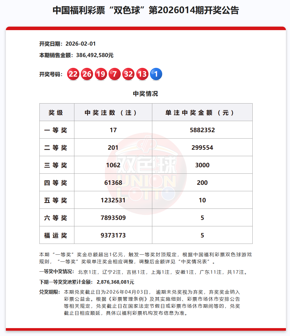 【开奖】双色球第2026014期开奖公告
