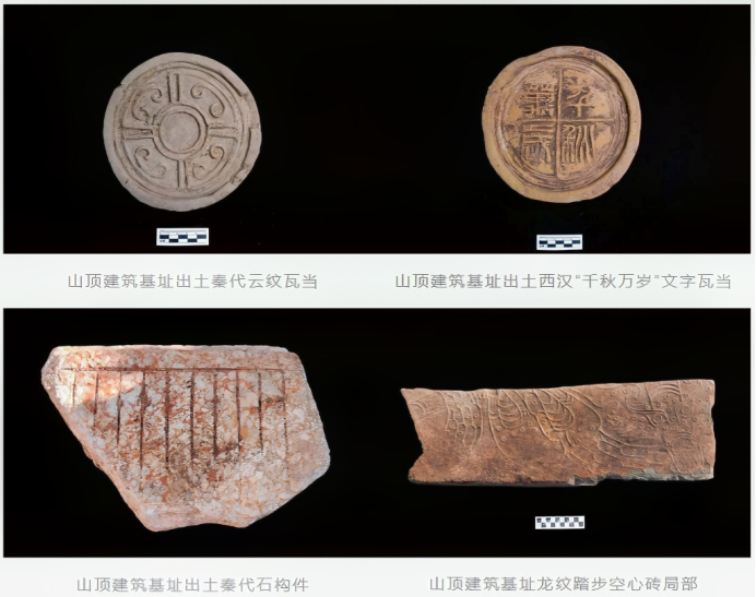 建筑局部有维修、改建迹象。出土大量建筑类遗物,分为两期:第一期为秦代,以绳纹瓦、云纹瓦当和素面砖为代表;第二期为西汉时期,主要为瓦棱纹瓦、“千秋万岁”文字瓦当和菱形、三角形纹砖等。秦代遗物中见夔纹大半圆瓦当和龙纹空心砖等高等级建筑构件,可证实山顶建筑为秦始皇二十八年“徙黔首三万户”所筑之琅琊台。