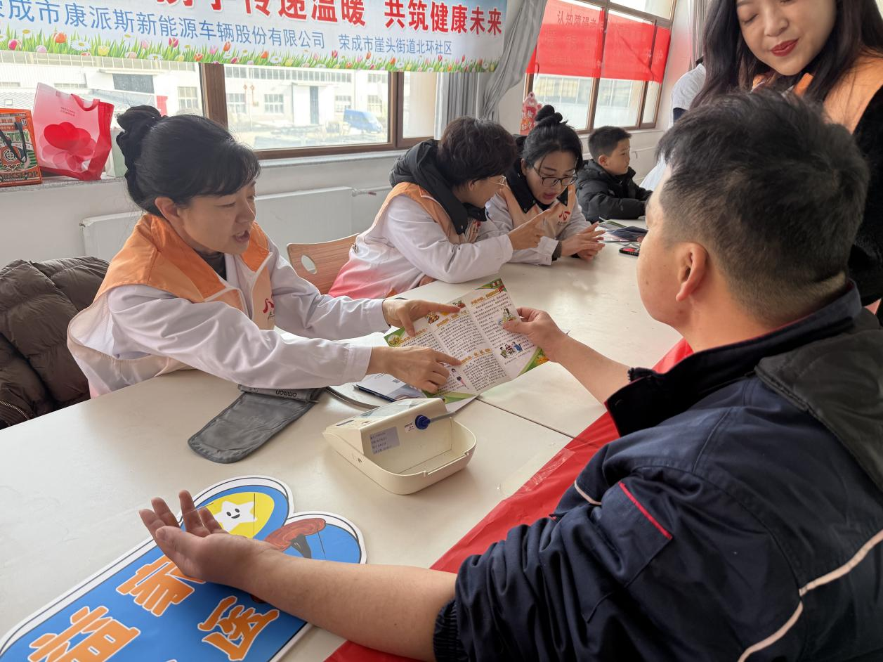 腊月年味渐浓,厂区暖意正浓。为深入推进新时代文明实践走深走实,深化文化社区共建内涵,推动文明实践服务延伸至企业一线、覆盖职工群体,日前,荣成市新时代文明实践中心联合崖头街道北环社区、荣成市益家人公益服务中心志愿团队,在荣成康派斯新能源车辆股份有限公司开展“近邻空间 焕新启航” 项目,将三甲诊疗、心理服务与非遗文化体验打包送进企业,让一线职工享受 “健康检查+文化盛宴” 的双重关怀。
