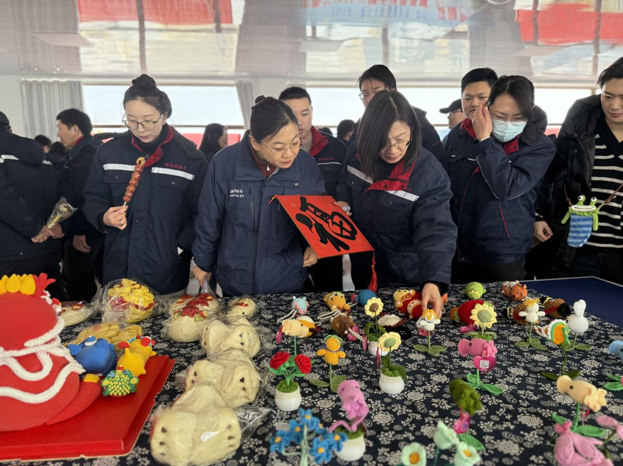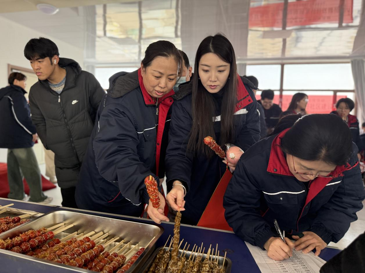 非遗小吃摊位:花饽饽红白相间的色彩里,藏着胶东大地的年节记忆,是蒸出来的民俗,是捧在手里的吉祥;一旁的冰糖葫芦晶莹剔透,琥珀糖衣裹着鲜红山楂,引得职工们排起了长队。大家在品尝“舌尖上的非遗”时,仿佛重回童年集市,于美食与手作交织间,触摸传统民俗最鲜活的脉搏。
