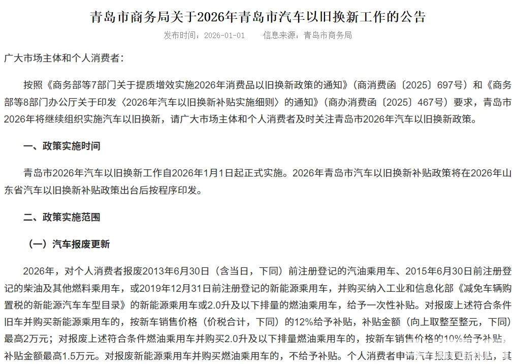 1月1日,青岛市商务局通过官方渠道面向全市广大市场主体和个人消费者正式发布《关于2026年青岛市汽车以旧换新工作的公告》,明确汽车报废补贴最高2万元,汽车置换补贴最高1.5万元。