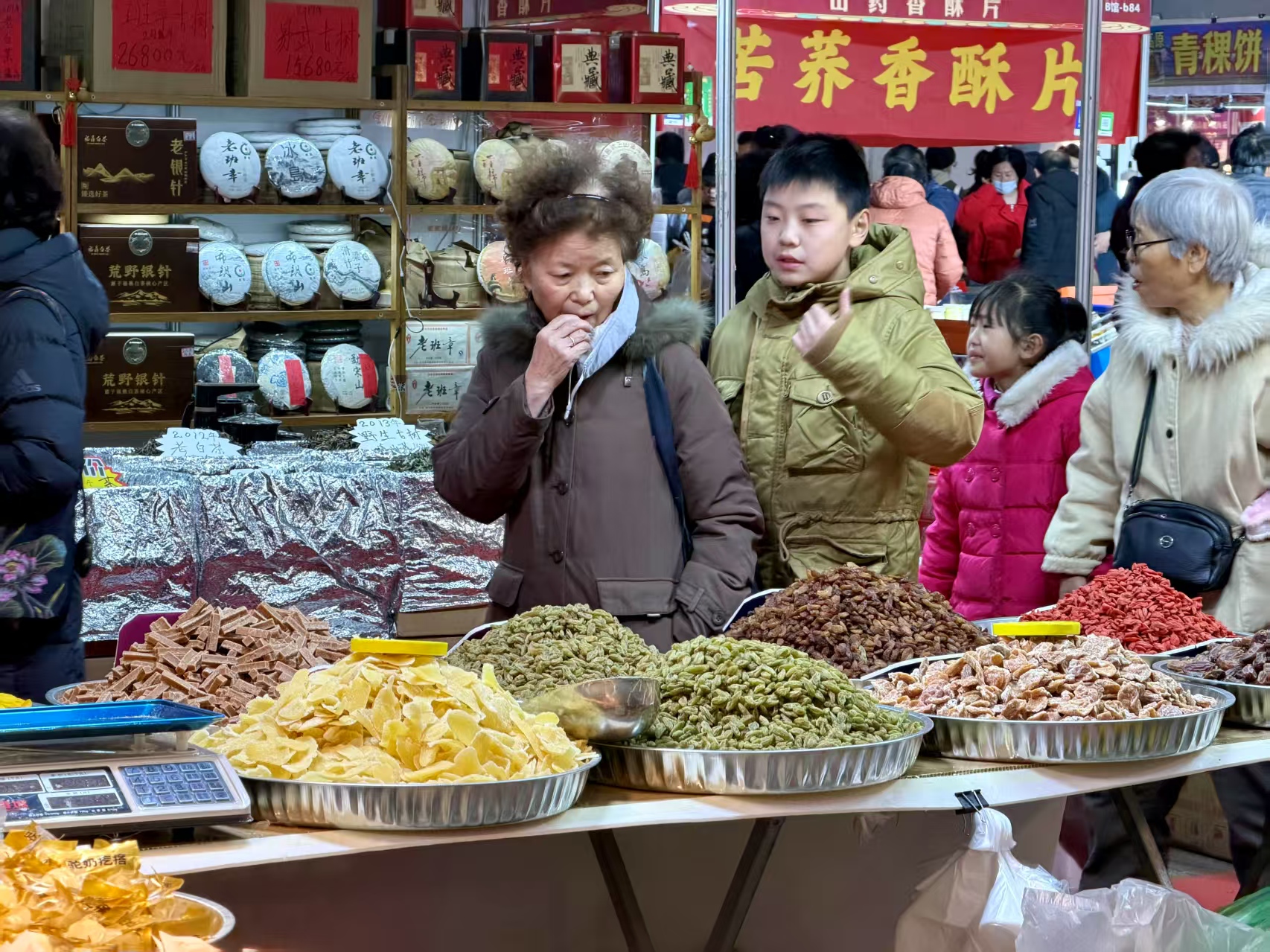 B馆云南特产展位前,来自云南的老板李燕琼热情介绍着各类特产:“山东人豪爽、大气,特别认可云南特产,光鹿茸菌就卖了400多斤。”72岁的徐大爷手里拎着三罐三七粉,笑着说:“大集不光有本地特产,还有全国各地的好东西,展厅里也不冷,和老伙伴们能逛大半天,很开心!”