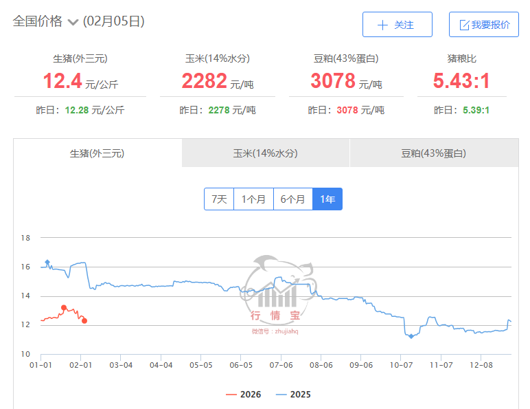 截至2月5日,2025年至今的猪价走势。来源:行情宝