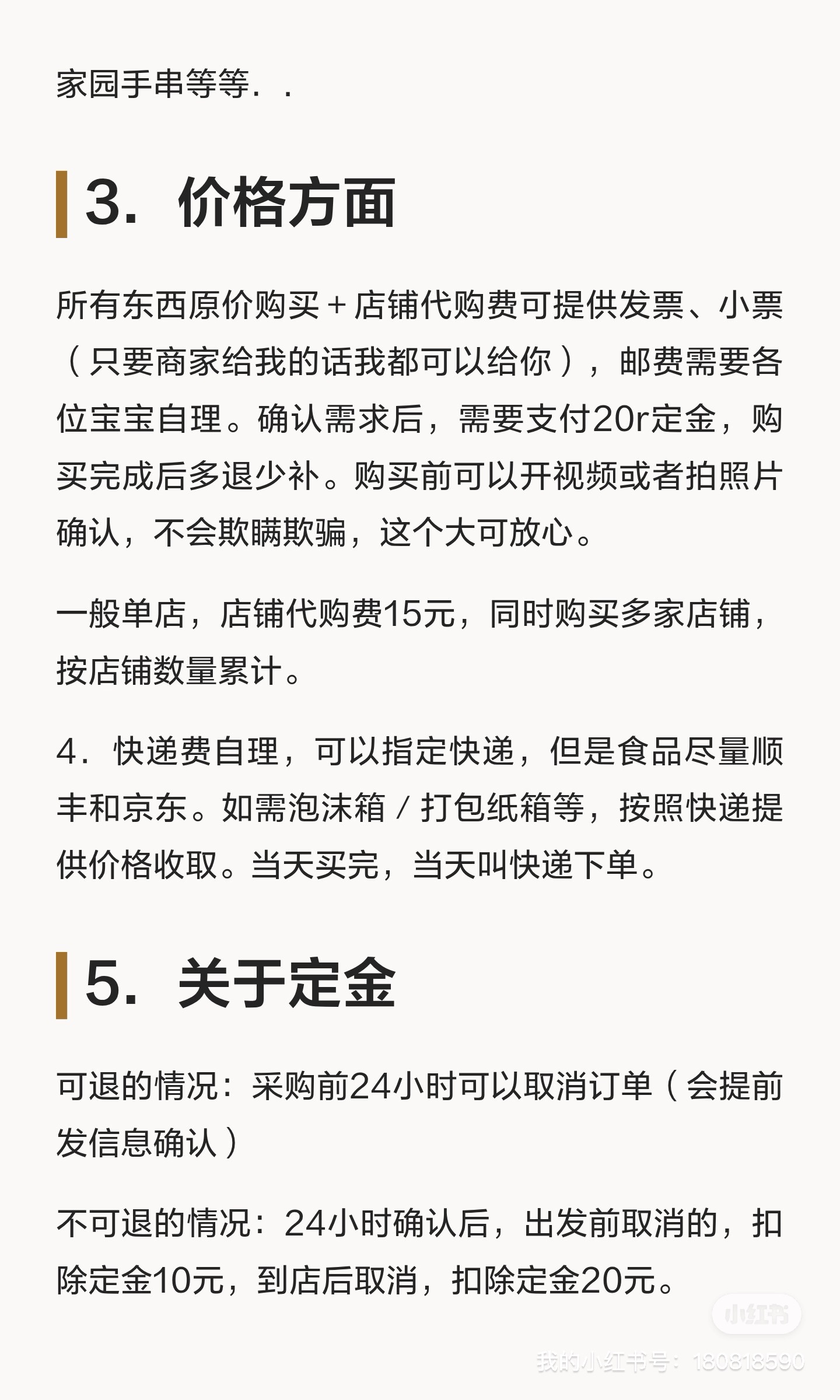 网友@少女的日常生活分享,其代买列表涵盖20余个北京知名品牌,食品类定价规则为“单店代买费25元,多店合买有优惠,单店商品重量超2.5公斤加收10元,交易前需支付20元定金,邮费由买家自理”。