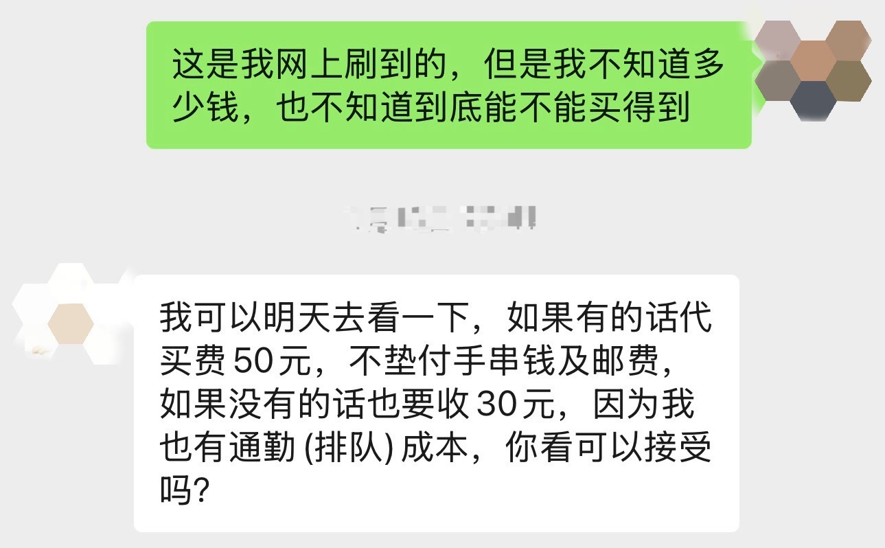 记者以购买雍和宫手串为由咨询,代买者表示第二天去雍和宫看看,有货的话代买费50元,不垫付货款和邮费,没货也要收30元通勤费。