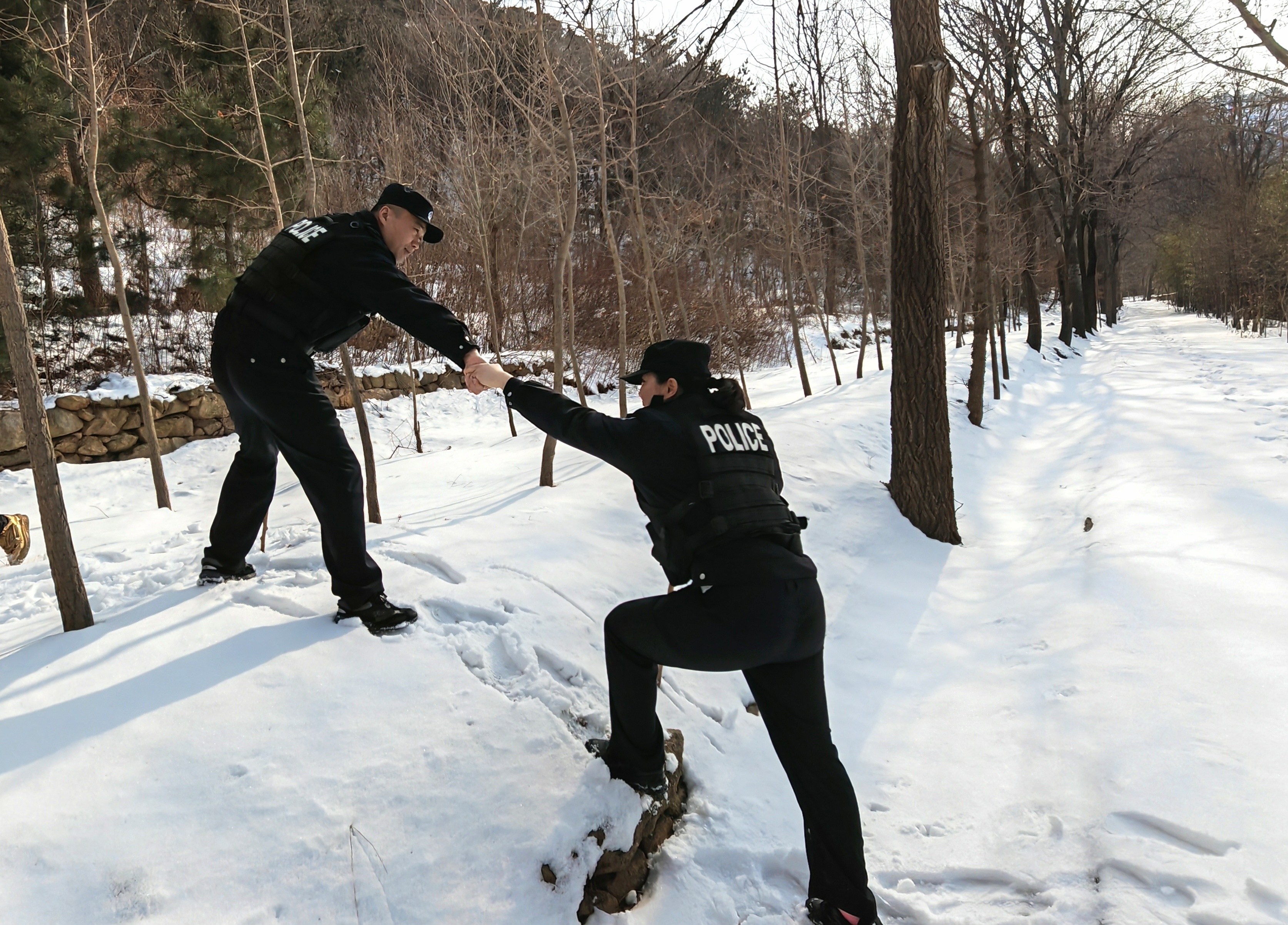 积雪没过脚踝,昆嵛派出所所长张洋洲和民警王妍踏上了冬日巡山路。