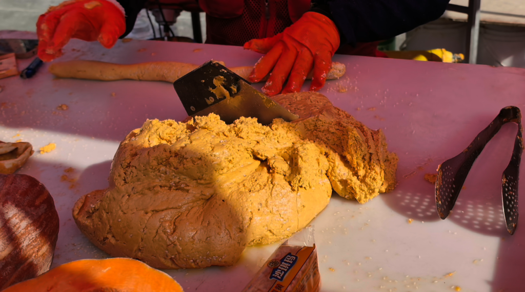 从哈尔滨来的摊主正在制作南瓜芝麻球
