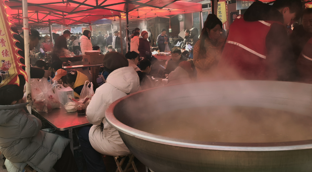 今年的李村大集新开辟了特色小吃街,南北风味小吃琳琅满目,满足了市民的多元味蕾需求。街区最显眼的位置,两口直径约一米半的大锅热气腾腾,炖牛肉、煮羊汤的香气飘散四溢,摊位前座无虚席,食客们围坐而食,暖意驱散了冬日严寒。