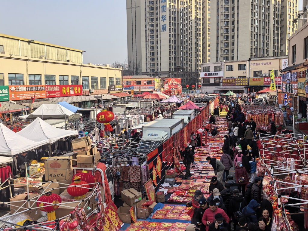 步入露天市场,商户们的备货工作进入收尾阶段。蔬菜、鲜肉、鲜果、干果的摊位依次排开,几乎每个摊位后方都停着满载货品的小卡车,成箱的果蔬、成袋的干货堆叠整齐,商户们搭货架、摆货品、理价签,动作麻利又娴熟。两位蔬菜摊主的闲聊,透着市井最鲜活的底气:“我昨天卖了1000多元!”“那咱看看今天谁财气更旺”,几句玩笑话里,是对年集生意的满满期待,也藏着小商户们踏实打拼的生活热忱。
