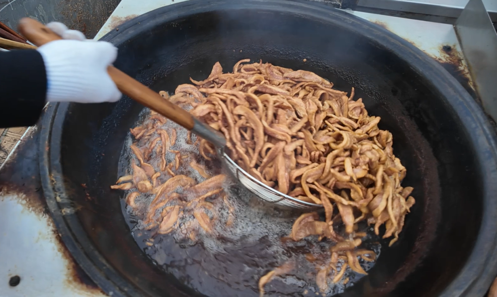 若说哪种美食能代表青岛,本土脂渣当之无愧。李村大集的脂渣摊位经久不衰,是老青岛人赶年集必买的年味美食。摊主王经理一边给刚出锅的脂渣撒盐、翻拌均匀,一边向记者介绍:“今天备了2000 斤鲜肉,现炸现卖,看这架势腊月十七的集肯定能卖空。到腊月廿二、廿七的大集,备货量至少翻一倍,得准备四五千斤肉才够卖!”