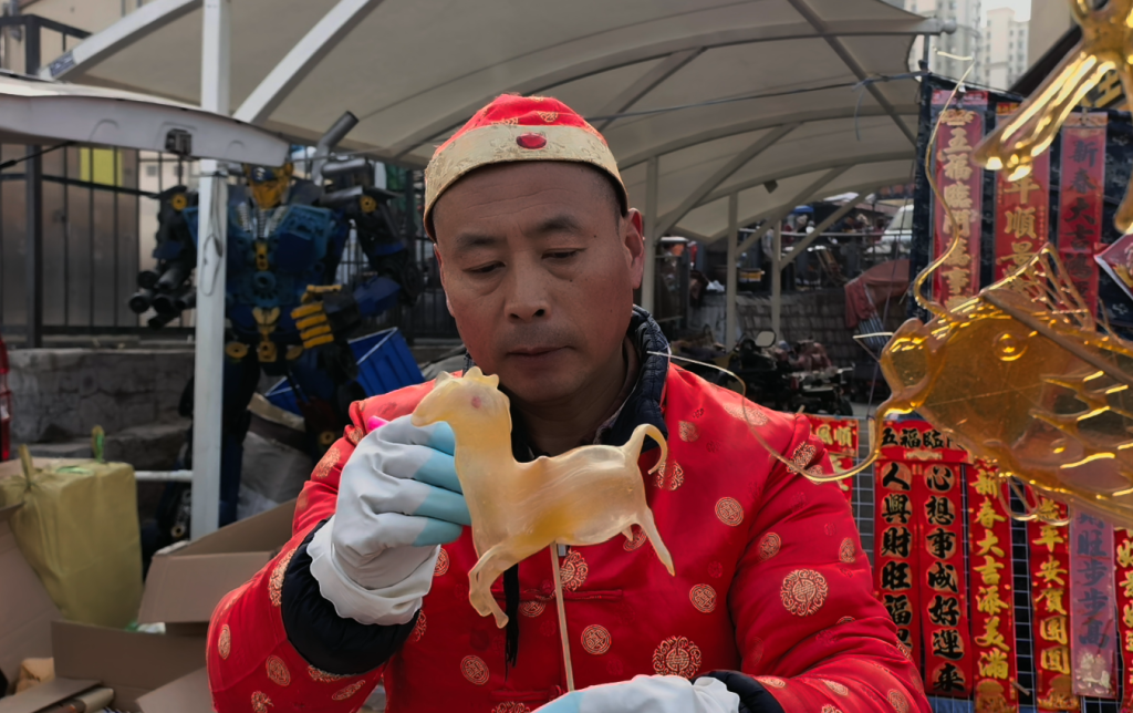 在香案、红蜡摊位与对联摊位的夹缝间,一处仅两米宽的小摊位格外吸睛——非遗吹糖人、糖画手艺人张杨卫的操作台前,围满了拍照的市民与好奇的孩童。来自河南南阳新野的张杨卫,2000年便来到青岛,从酒店糖艺雕刻转行后,便带着四百年的吹糖人手艺,在青岛扎根传承。