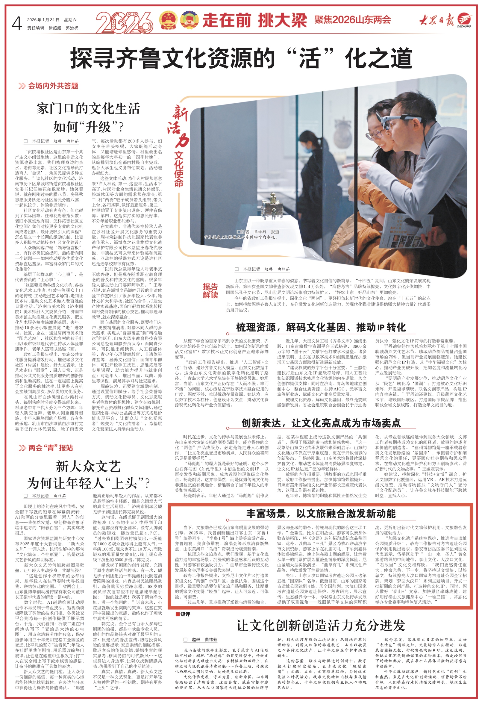1月31日,4版要闻刊发《探寻齐鲁文化资源的“活”化之道》,报道泰安市岱岳区委书记刘国成代表谈文旅融合。详情请点击这里—