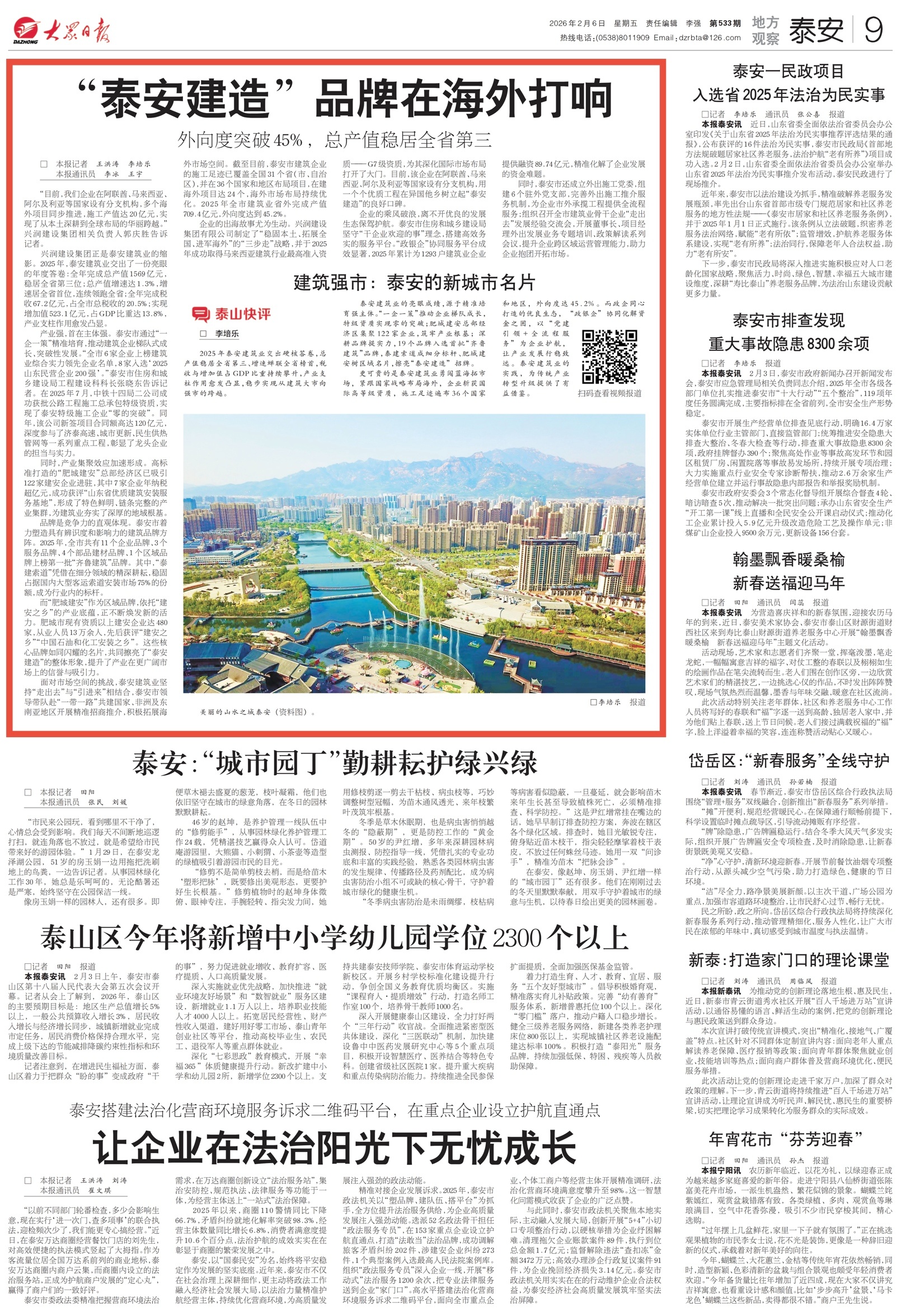 2月6日,大众日报《泰安新闻》推出重磅策划《“泰安建造”品牌在海外打响》,报道2025年,泰安建筑业交出了一份亮眼的年度答卷:全年完成总产值1569亿元,稳居全省第三位。详情请点击这里—