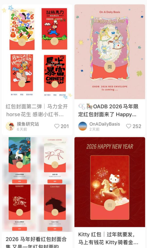 在小红书等社交平台上,马年红包封面早已火热登场。这些热销的红包封面,单价几元到几十元,融合了生肖、国潮、热门IP乃至自定义元素,凭借轻量化、个性化、强社交属性成为年轻人的新年新宠,也撬动了年货经济的数字化转型。