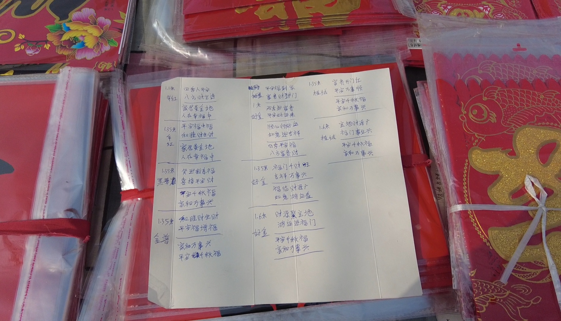 说话间,老曹从一堆福字底下掏出一张香烟的外包装纸壳,“炫耀”起来。细细观瞧下,纸壳被老曹完全裁剪铺开,内侧一面写满了字。这是老曹为满足顾客多样化需求,将对联的内容、规格,福字的样式等分门别类地写在了上面。老曹皴裂的手挥惯了锄头,再握起细笔来倒有些不自在,但他仍在纸壳上将每一个字一笔一画地写下,每一对春联都安排得条条清晰规整,方便顾客挑选。