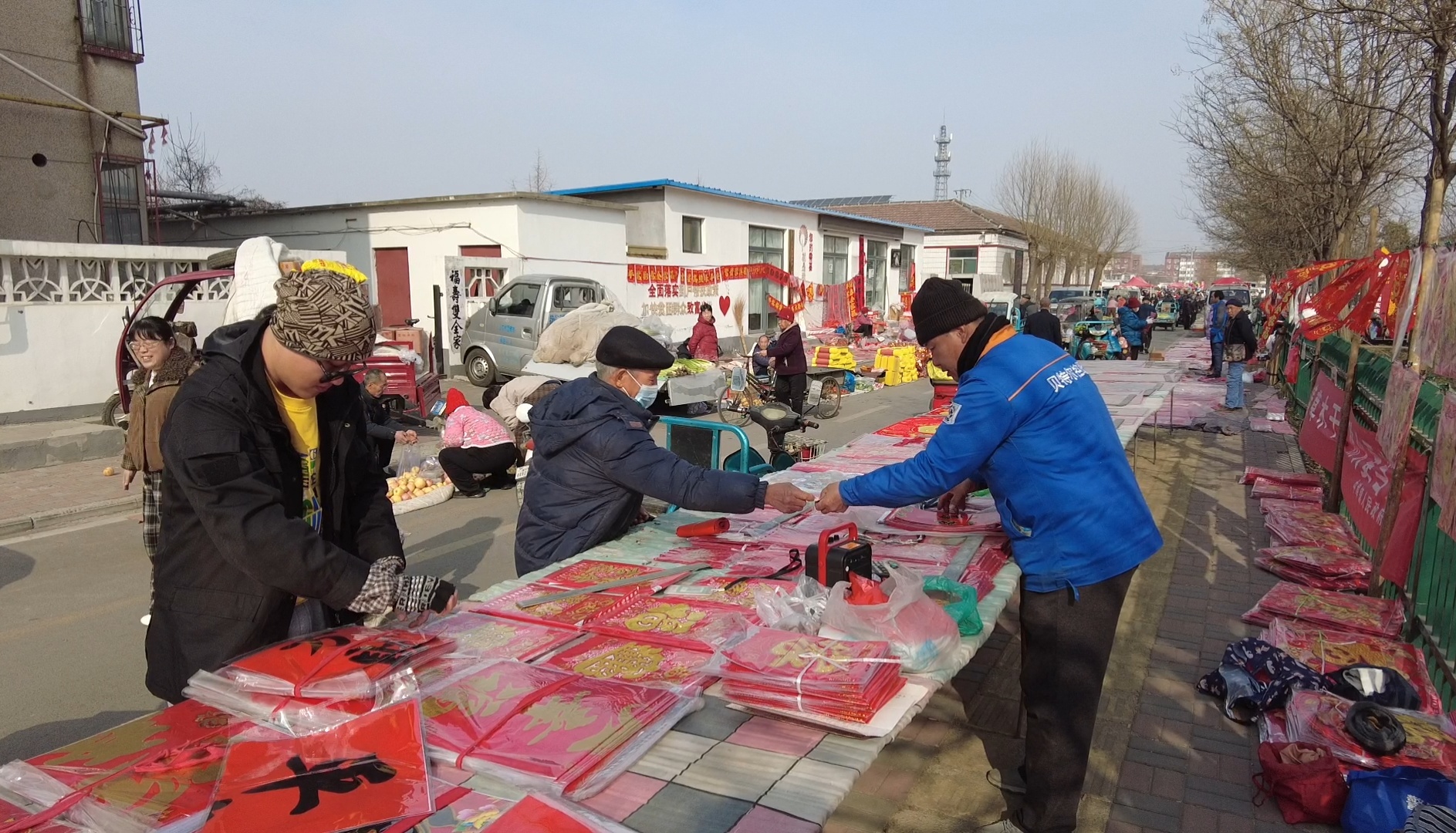 作为年集上最热闹的摊位之一,老曹的摊位上红底的春联、福字整齐排列,摊位前不断有赶集的人挑选。