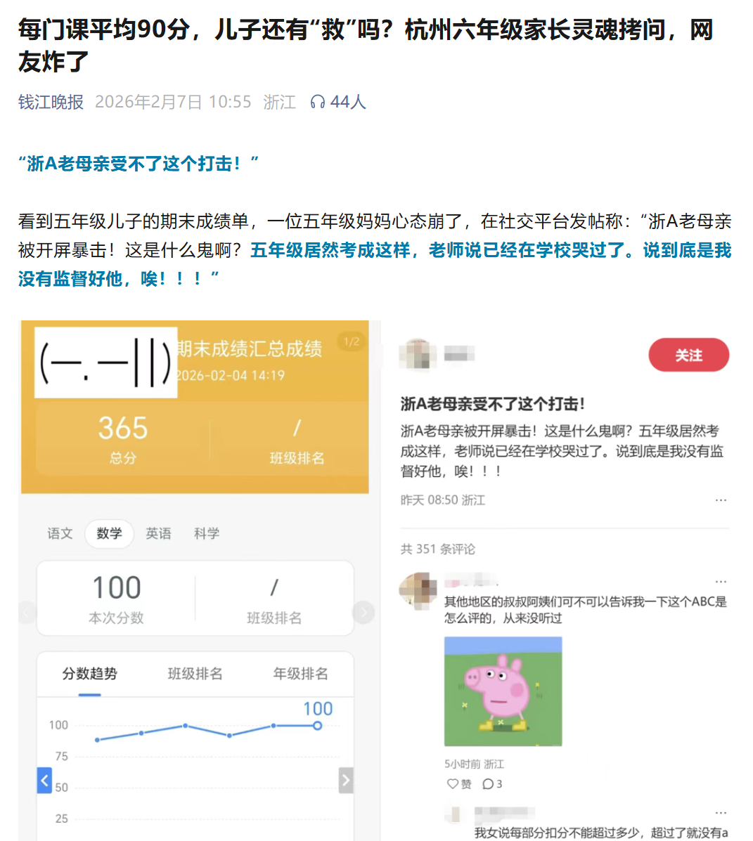 据钱江晚报2月7日报道,杭州一位五年级家长因孩子期末数英双百、总分365分陷入焦虑,直呼遭受“开屏暴击”;六年级家长金女士更是因孩子数学93.5分未达中位分,忽略其总分进步的事实,在电话中斥责孩子,让满心欢喜的孩子委屈落泪。