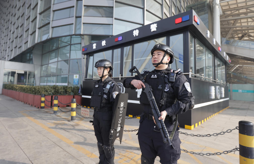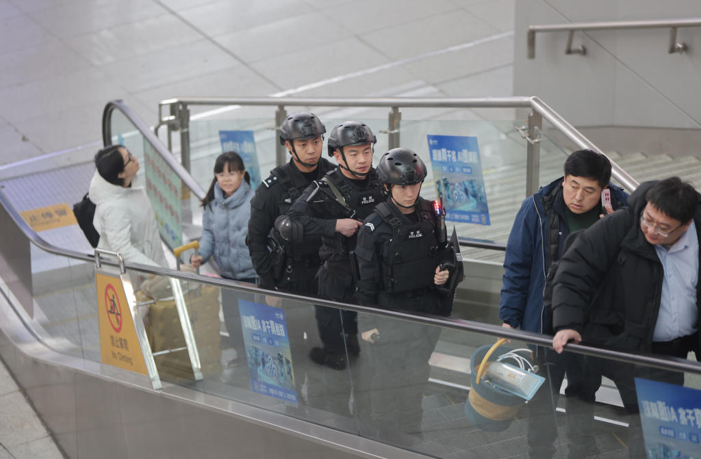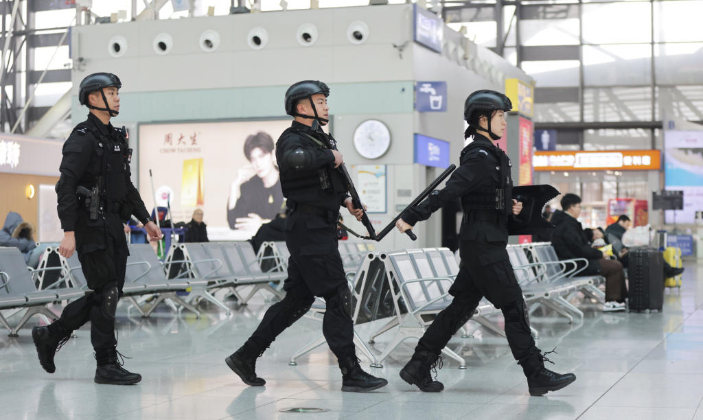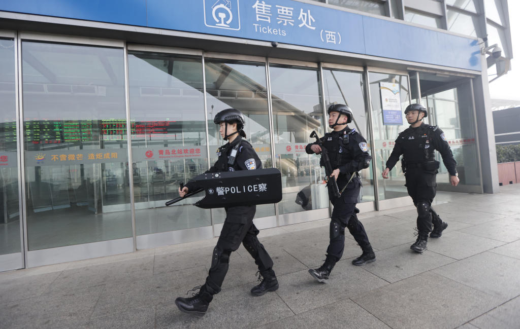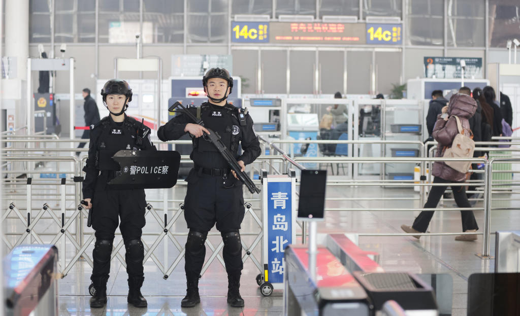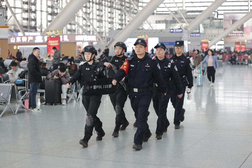 2 月 7 日,青岛火车北站内,青岛铁路公安处特警与青岛北站派出所民警联合开展巡逻防控工作,对候车大厅、站台等重点区域进行全覆盖巡查,确保安保防控无死角、无遗漏。