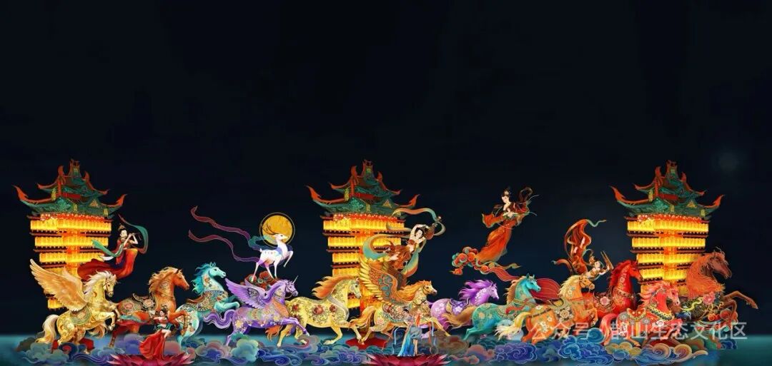 “大河颂歌主题区”则着力展现黄河文化的雄浑壮丽。灯组以奔腾的骏马群像隐喻黄河之水天上来,气势恢宏;马群之上,敦煌飞天形象翩然起舞,衣带当风,生动演绎着黄河千年文明的流淌与传承。