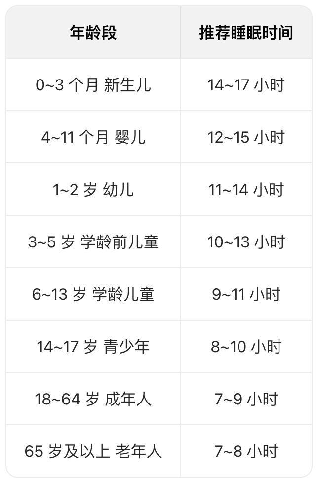 美国睡眠基金学会分析了312个睡眠研究,对不同年龄段需要的睡眠时间做出了推荐: