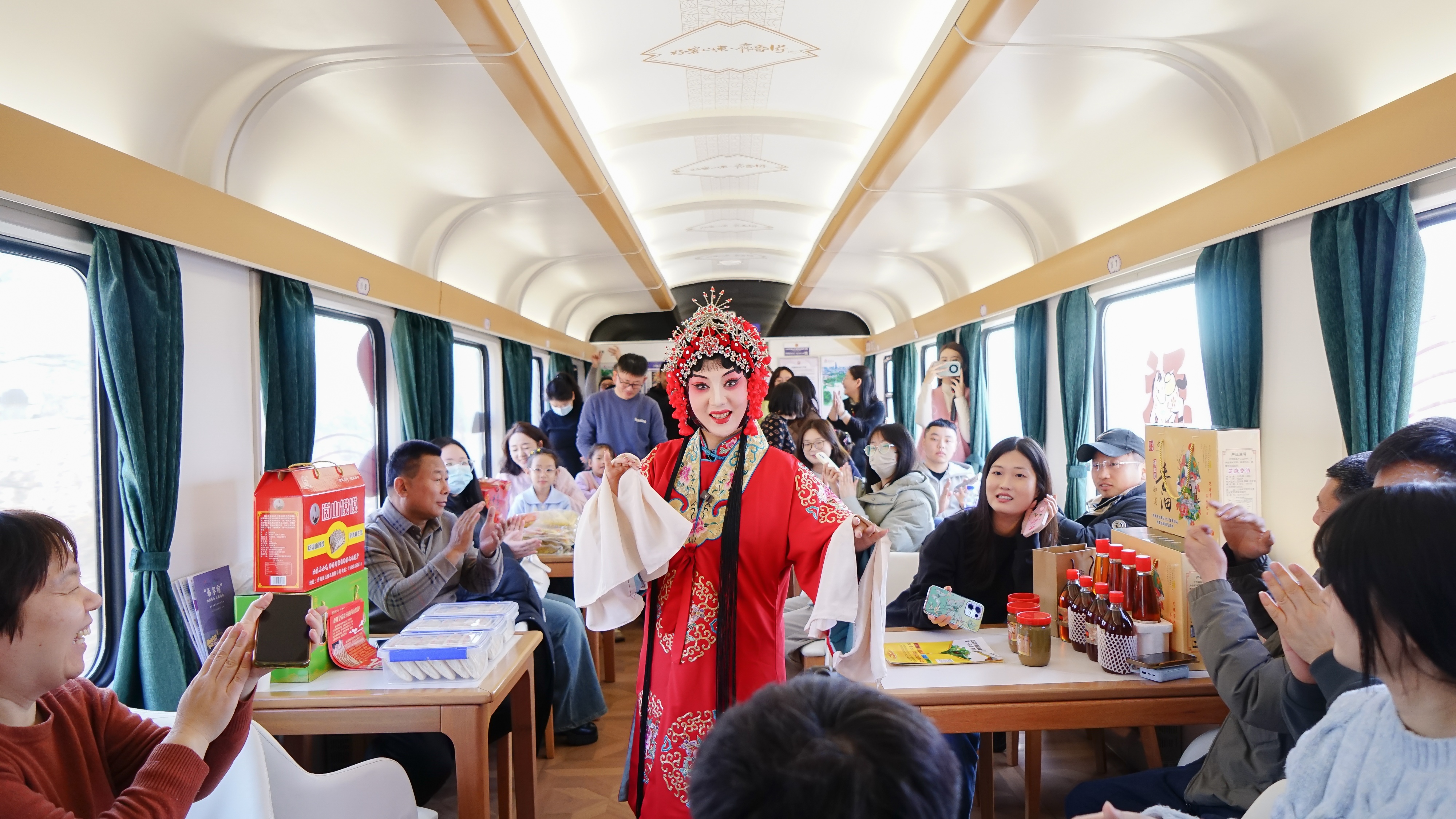 车厢内,五大特色板块依次铺开:特色好物市集上,黄家峪小米、尹街卤鹅等农产品琳琅满目;怀旧美食餐车里,黄河鲤鱼、长清小米米粉、双泉豆腐皮热气腾腾;非遗茶点专区飘出长清茶与御菊茶的清香;灵岩风光专区则以“灵岩小书生”“灵岩年货郎”两大IP与乘客互动,答对诗词即赠景区门票;山东梆子戏的铿锵唱腔在餐车回荡,演员边演边讲,让非遗“活”在旅途。