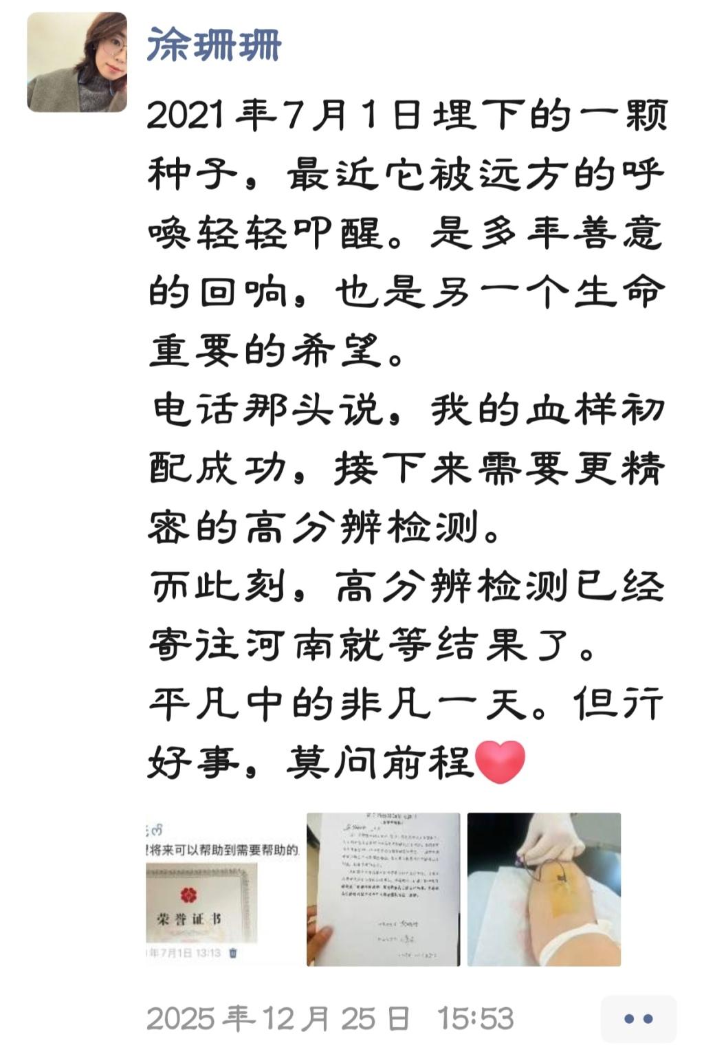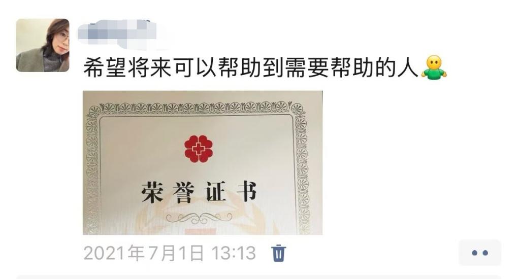 2021年时,采集完造血干细胞后获得的荣誉证书,徐珊珊在朋友圈做了日常记录