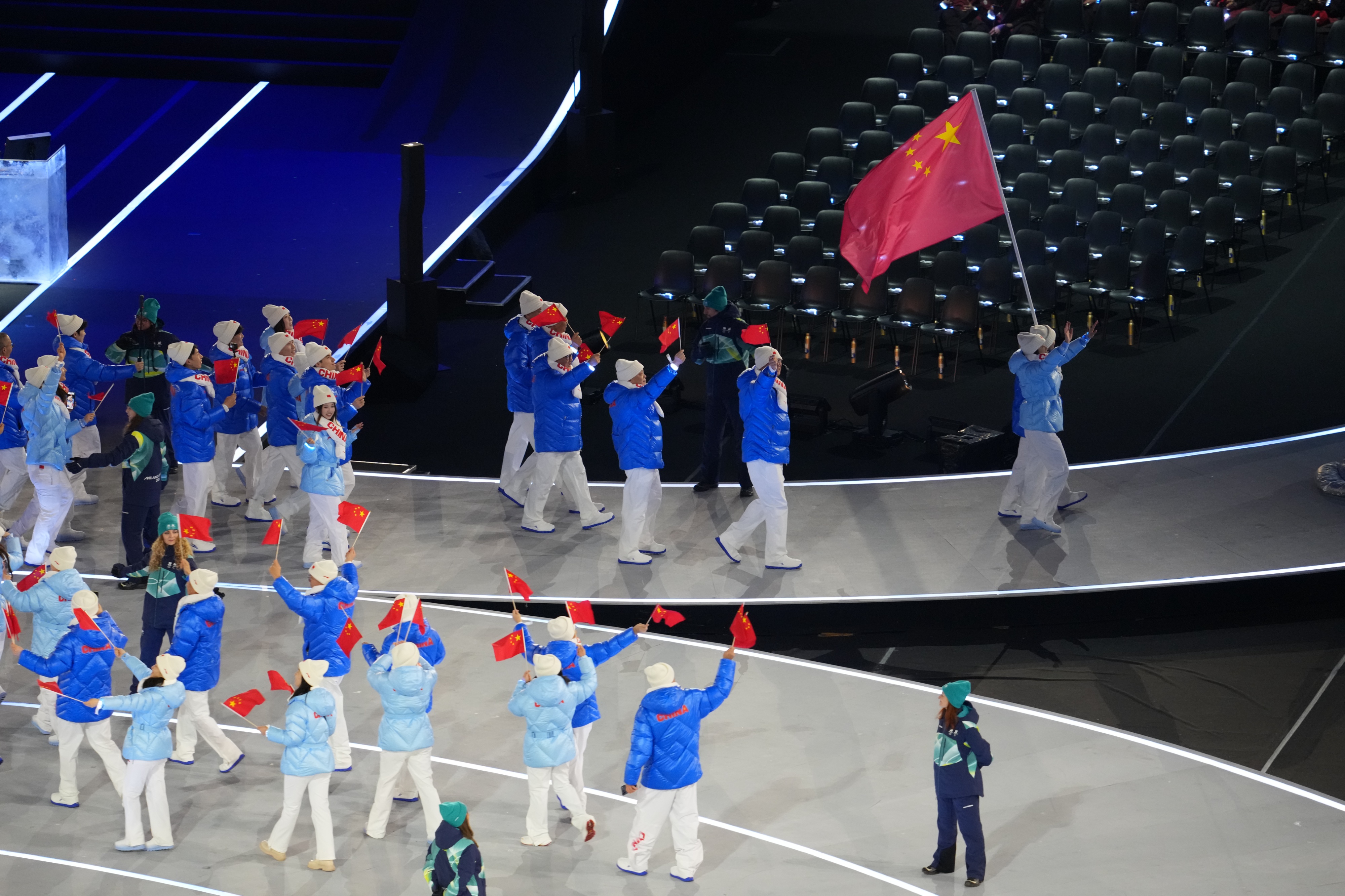 速度滑冰男子运动员宁忠岩与短道速滑女子运动员张楚桐高擎五星红旗,带领中国健儿昂首步入会场。