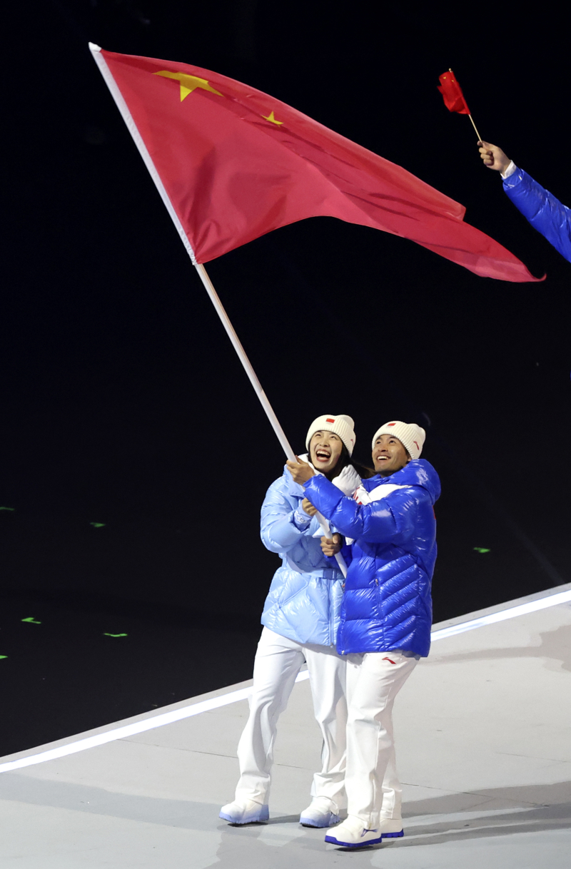 新华社照片,北京,2026年2月7日 2月6日,中国代表团旗手宁忠岩(右)、张楚桐在开幕式上入场。 当地时间2月6日,2026年米兰-科尔蒂纳冬奥会开幕式在意大利米兰圣西罗体育场举行。 新华社记者 杜潇逸 摄
