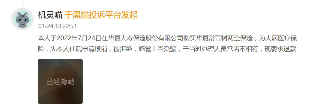 2月6日,记者登录黑猫投诉平台官网看到,平台中共有418条投诉包含关键字“瑞众保险”,投诉问题主要聚焦于承诺虚假、误导销售等,有的用户也遭遇了与张女士类似的情况。1月24日,一位用户在黑猫投诉平台中表示,“2022年7月24日,我在华夏人寿购买了华夏常青树两全保险,是一款大病医疗保险。现在我住院申请报销却被拒绝,这和当时办理人员的承诺不相符。”