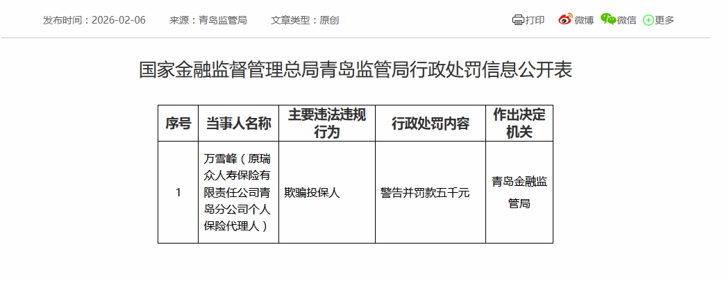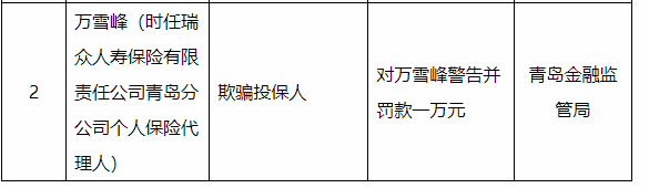 而2025年12月11日,国家金融监督管理总局青岛监管局披露的信息显示,万雪峰(时任瑞众人寿保险有限责任公司青岛分公司个人保险代理人)因欺骗投保人被警告并罚款一万元。