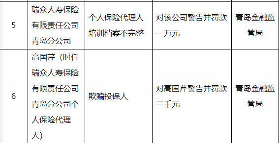 2025年10月23日,国家金融监督管理总局青岛监管局官网公示的行政处罚决定书显示,高国芹(时任瑞众人寿保险有限责任公司青岛分公司个人保险代理人)因欺骗投保人被警告并罚款3000元。