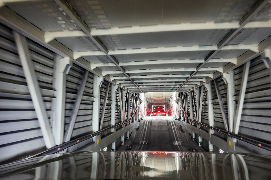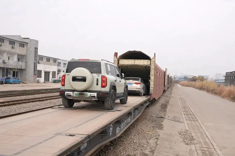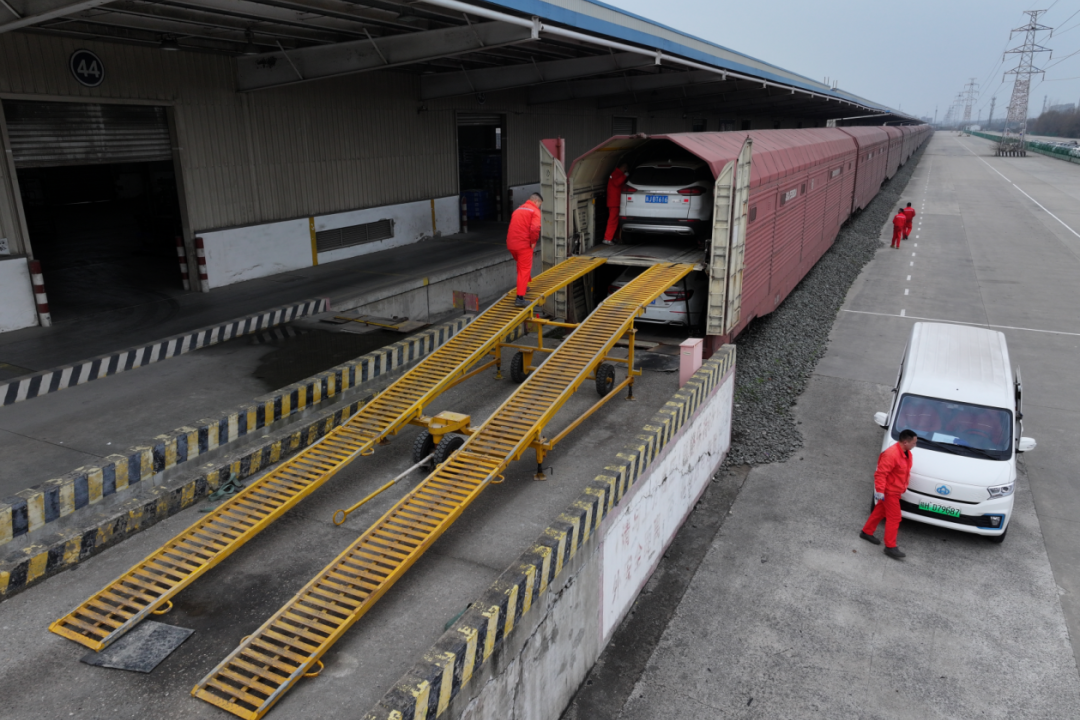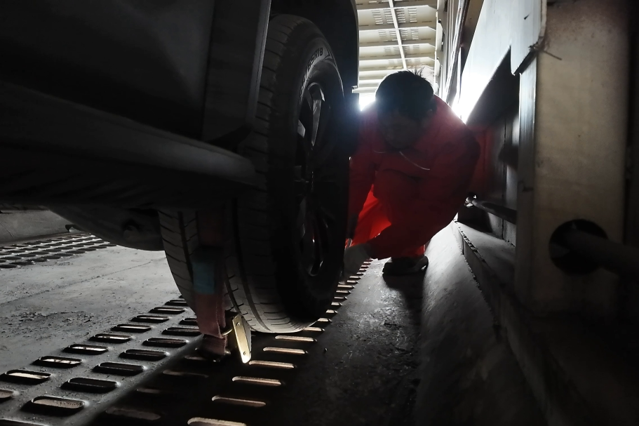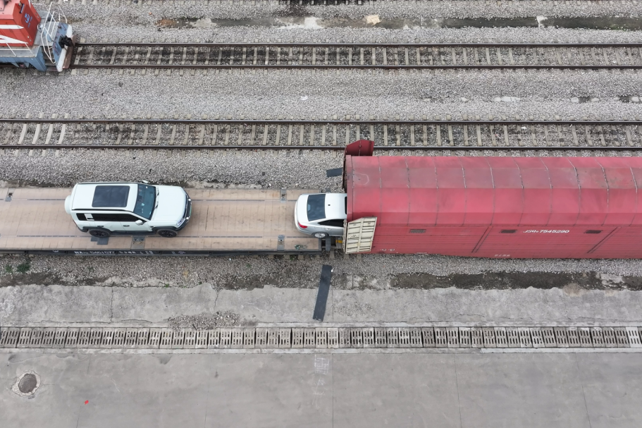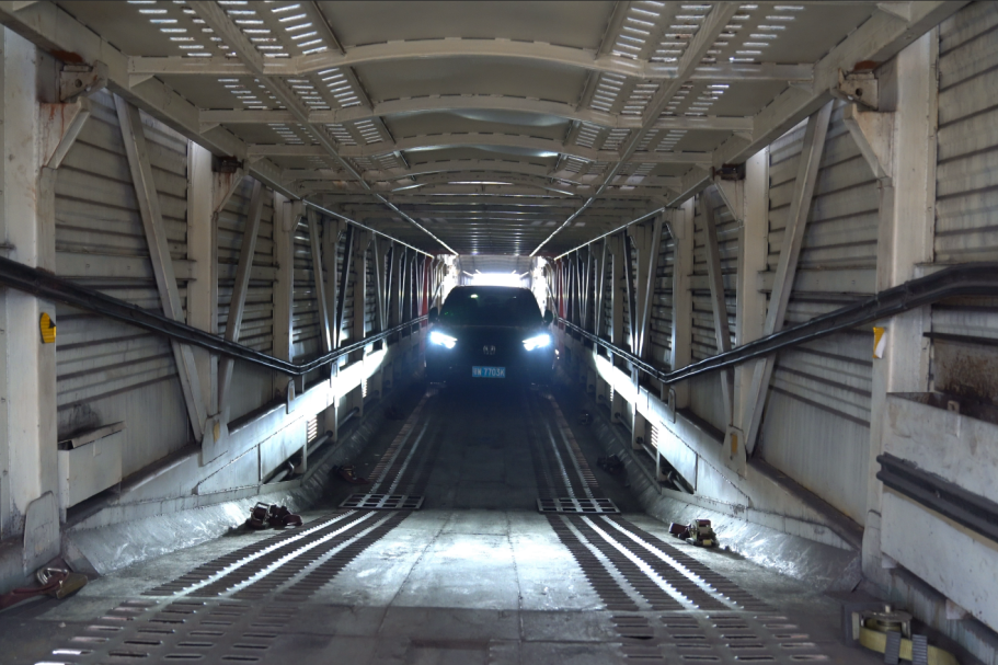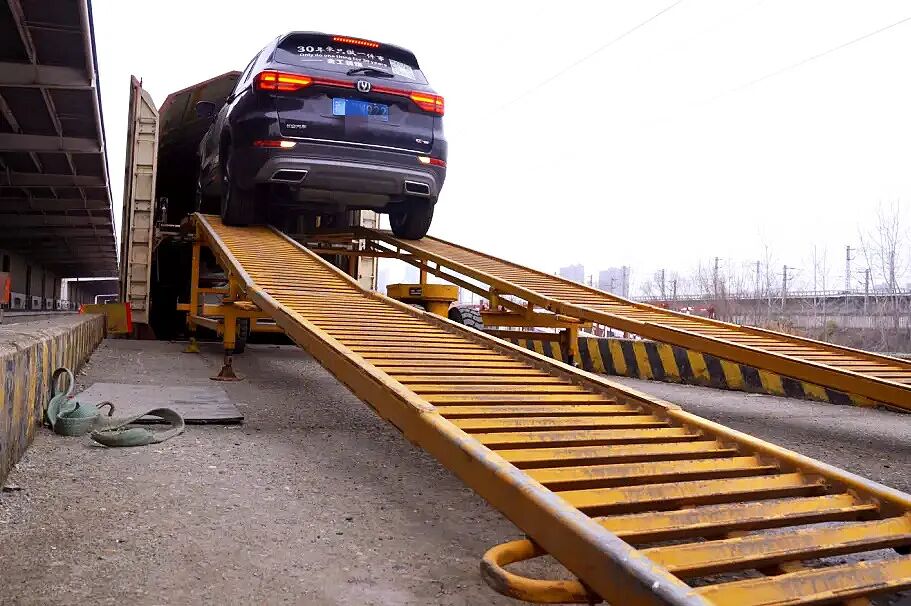 我被“摆渡人”送进一辆橘红色列车,这就是我的专属“移动豪宅”——JSQ6型凹底双层专用车厢。
