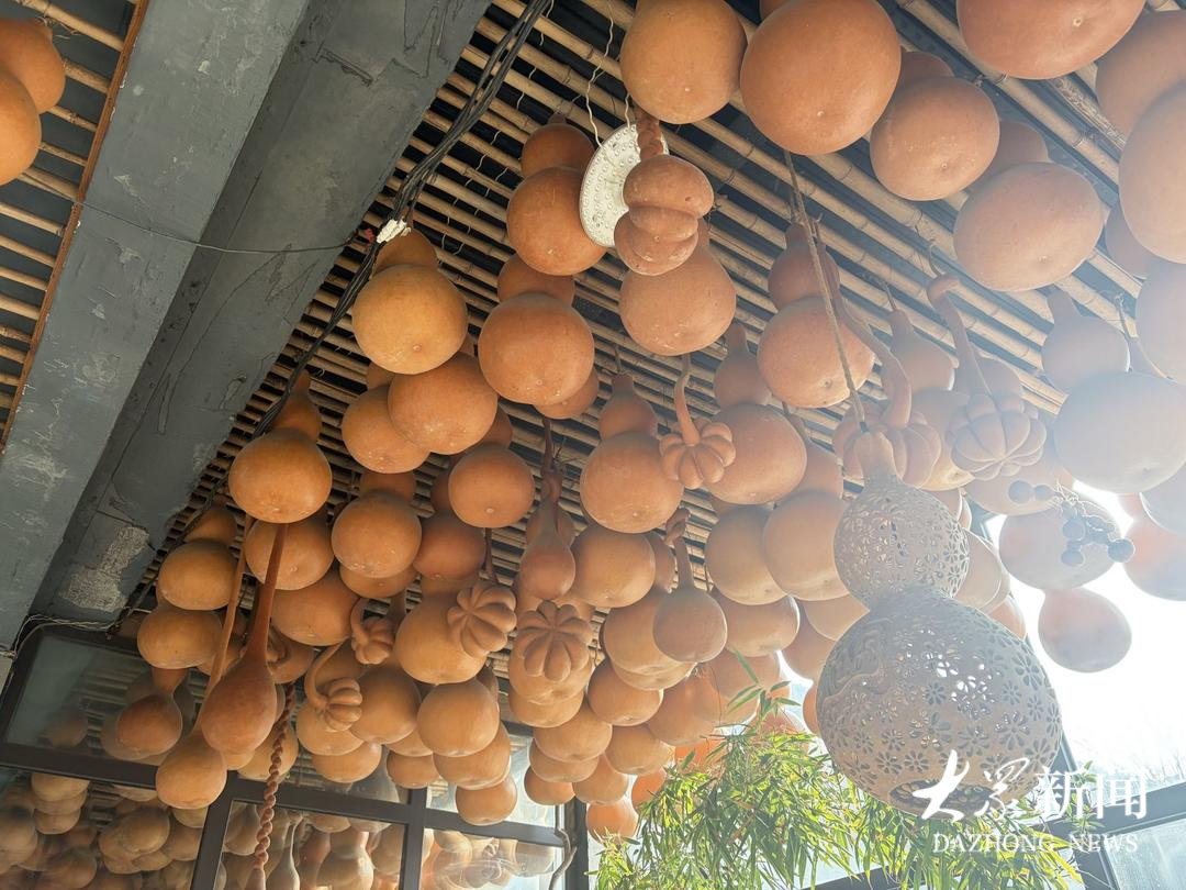 2月6日,记者到达章丘区文祖街道章来路东侧的济南友谊葫芦文化产业园时,被映入眼帘大大小小的葫芦所震撼。这个建设用地7000多平方米的产业园俨然成为了一个葫芦王国,就连茶室的墙壁和房顶上都缀满了葫芦。