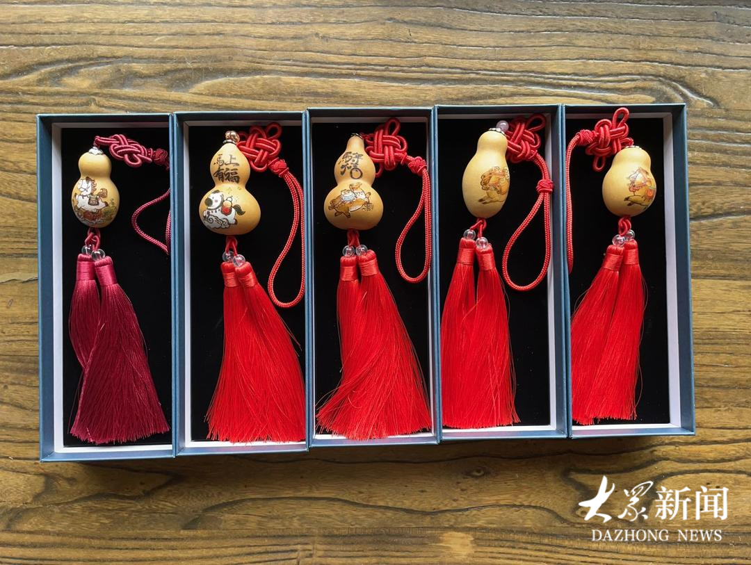 从家传手艺到广阔市场,马友谊的葫芦发展之路始于坚守与创新。“友谊葫芦是以我们章丘本地葫芦为原料,结合雕刻、镂空、烙画等传统技艺制作的手工艺品。”马友谊告诉记者,传统雕刻技法主要采用针刀并用技法,结合独家秘制松脂墨料实现雕刻与上色同步完成,纹样设计上过去着重展现传统文化、民俗元素,如今会融合年轻人喜闻乐见的卡通元素、流行符号等。