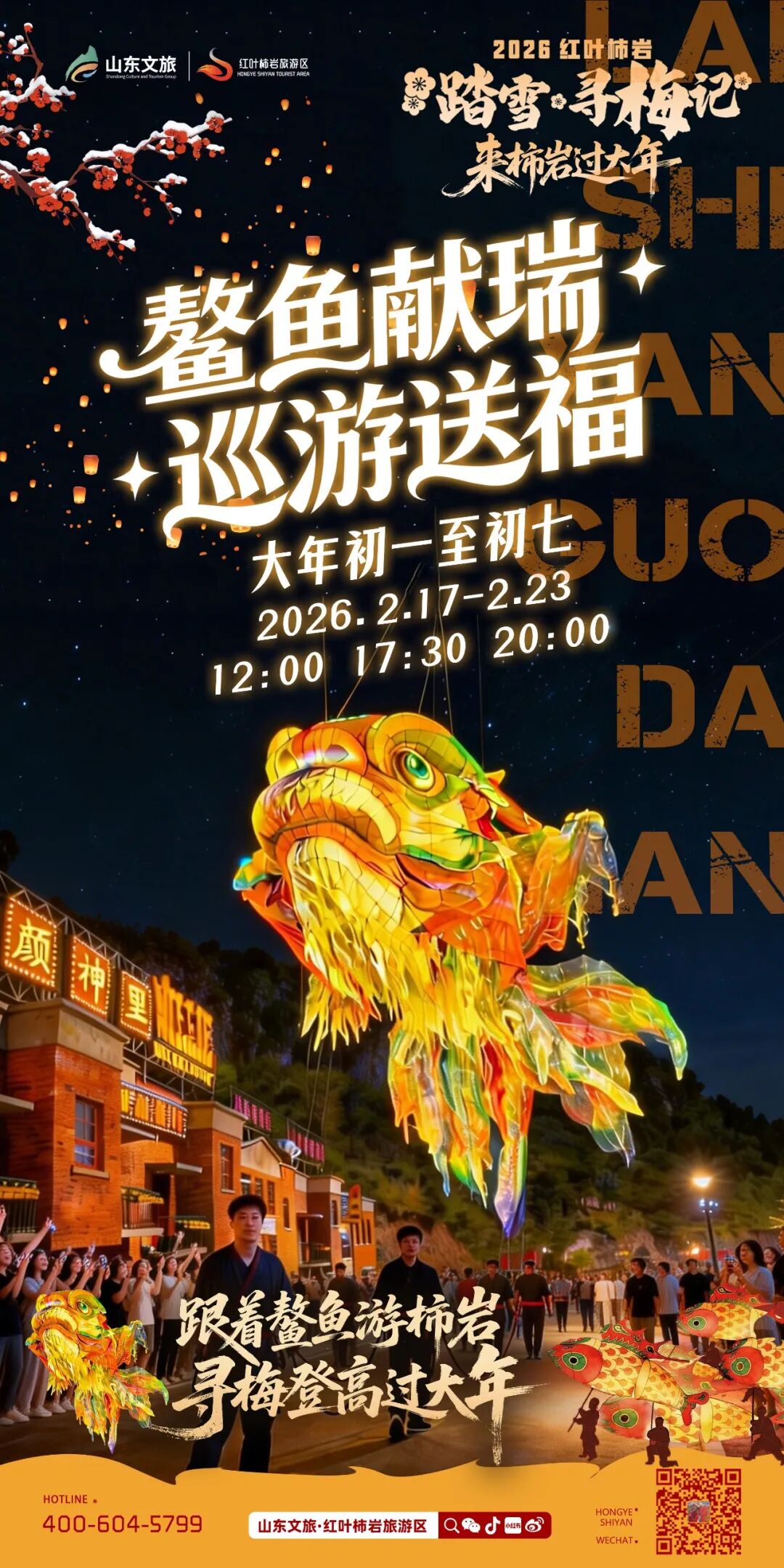 红叶柿岩景区以“踏雪寻梅记·来柿岩过大年”为主题,打造从白天到夜晚的全天候沉浸式中国年盛宴。活动围绕“鳌鱼巡游、踏雪寻梅、漂流登高、千灯会”四大核心展开,融入NPC互动、快闪演艺、非遗杂艺等内容。
