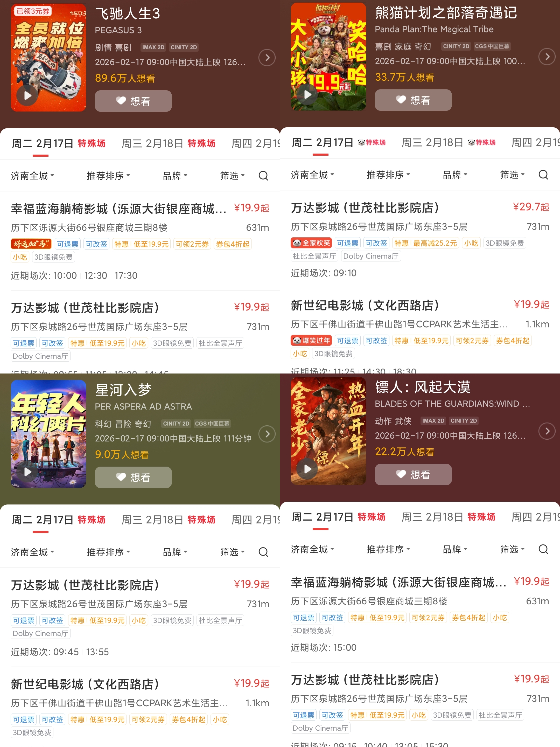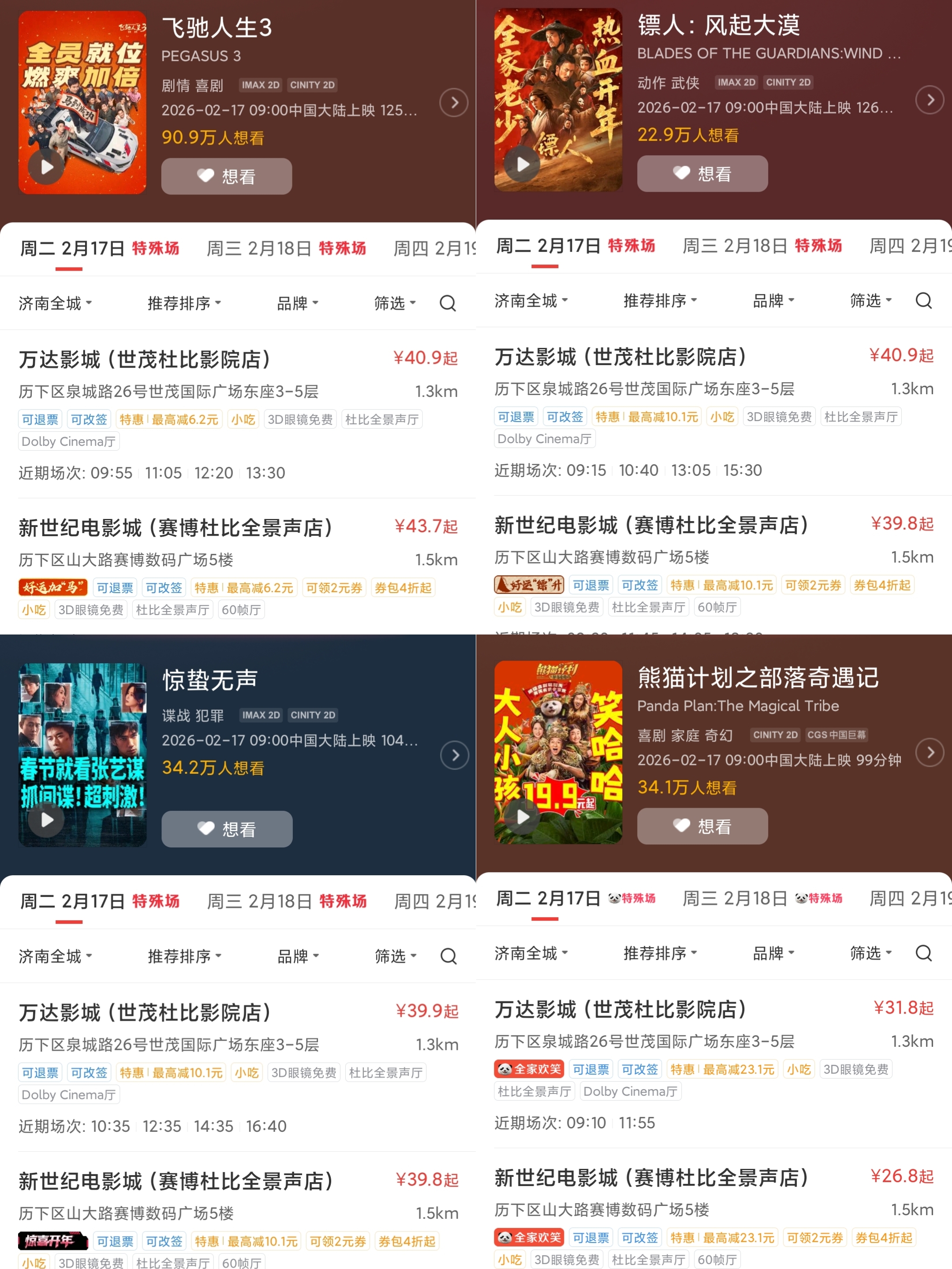 记者发现,2月10日下午,多部头部影片的19.9元场次已难觅踪影,价格普遍回调至40-60元区间,部分IMAX、CINITY等特效厅则直接跃上百元高位。中腰部影片为争取排片,则继续以降价策略吸引观众。