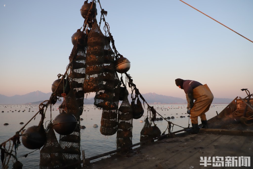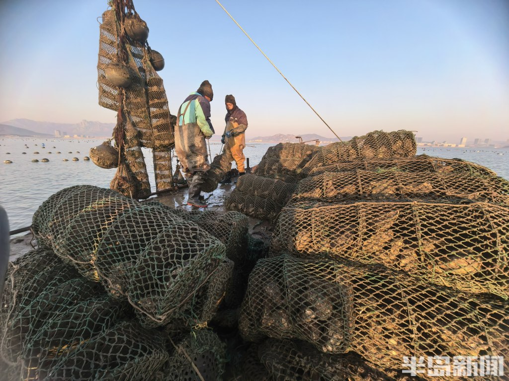 迎着朝阳与海风,常立业稳稳掌舵,小船劈波斩浪,不多时便抵达自家的养殖海域。这片海域是盘龙庄渔民的 “海上粮仓”,眼下正是海蛎子最为肥美的时节,也是春节前采收、供应市场的关键期。“以前捞海蛎子,全靠徒手拽绳、往下抠,一根绳上爬满海蛎子,费力气还慢,干一天也收不了多少。”常立业一边操作设备,一边和记者聊起今昔的变化。如今,渔民们用上了拔杆设备,只需用钩子勾住挂着海蛎子的浮漂绳,借助机械力就能一笼笼稳稳提上船,省时又省力。当天兄弟俩仅拔了六次杆,每次起获的海蛎子就有300多斤,短短一个半小时,便收获了2000多斤肥美的海蛎子。