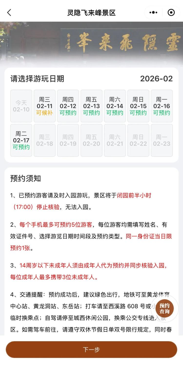 2月10日,记者打开杭州灵隐飞来峰微信小程序,春节假期中2月15日(腊月廿八)、2月16日(除夕)、2月17日(大年初一)的入园名额都可以提前预约了,截至晚上7点半,这几天依然处于可预约的状态。