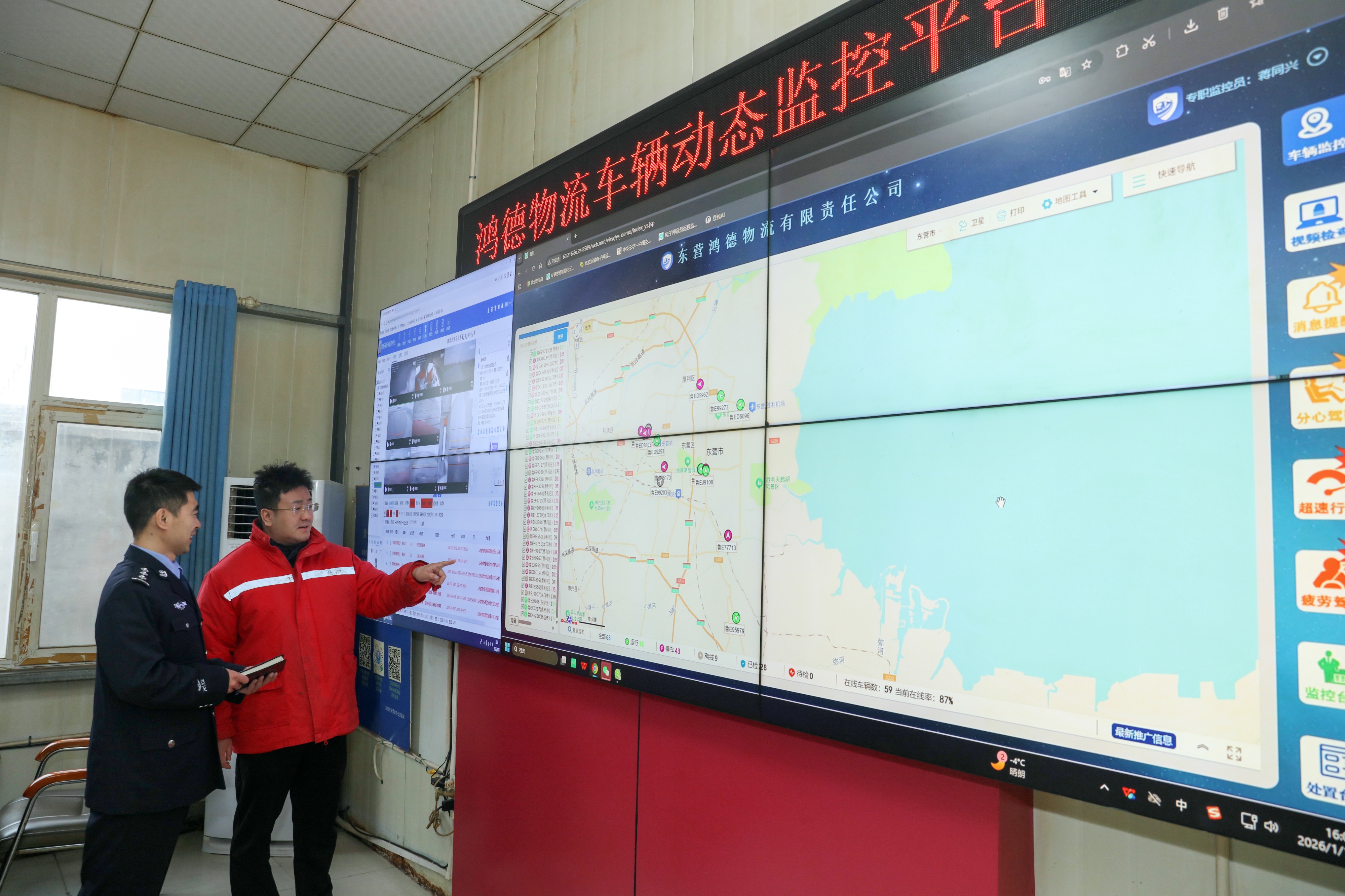 在东营鸿德物流有限责任公司车辆动态监控平台,一名远端押运人员正通过电脑对一名行驶途中的驾驶员发送安全提醒,驾驶员、驾驶室、罐体等车辆内外的实时动态画面在屏幕上一目了然。