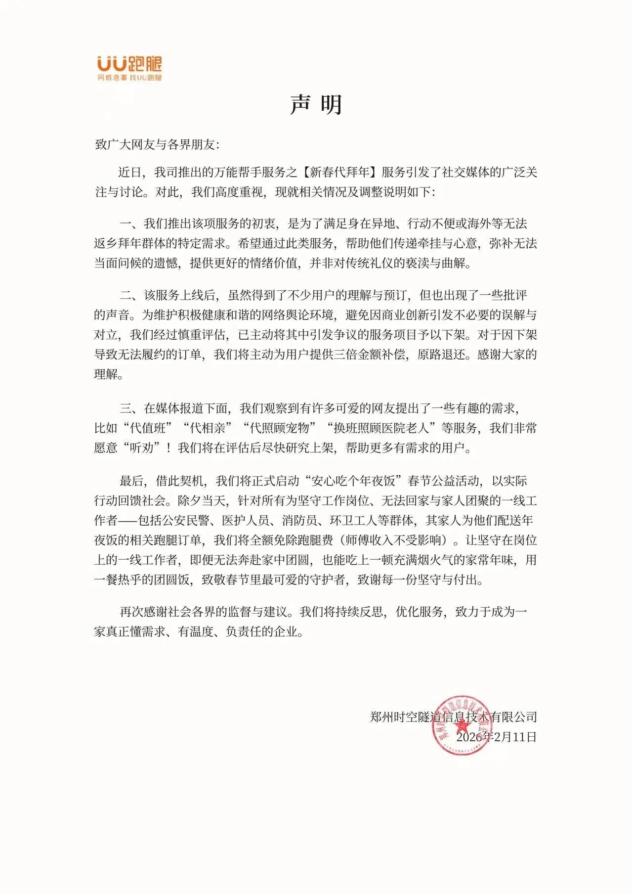 2月11日,平台运营主体,河南郑州时空隧道信息技术有限公司发布《关于代拜年服务的情况说明》表示,引发争议的服务项目予以下架。
