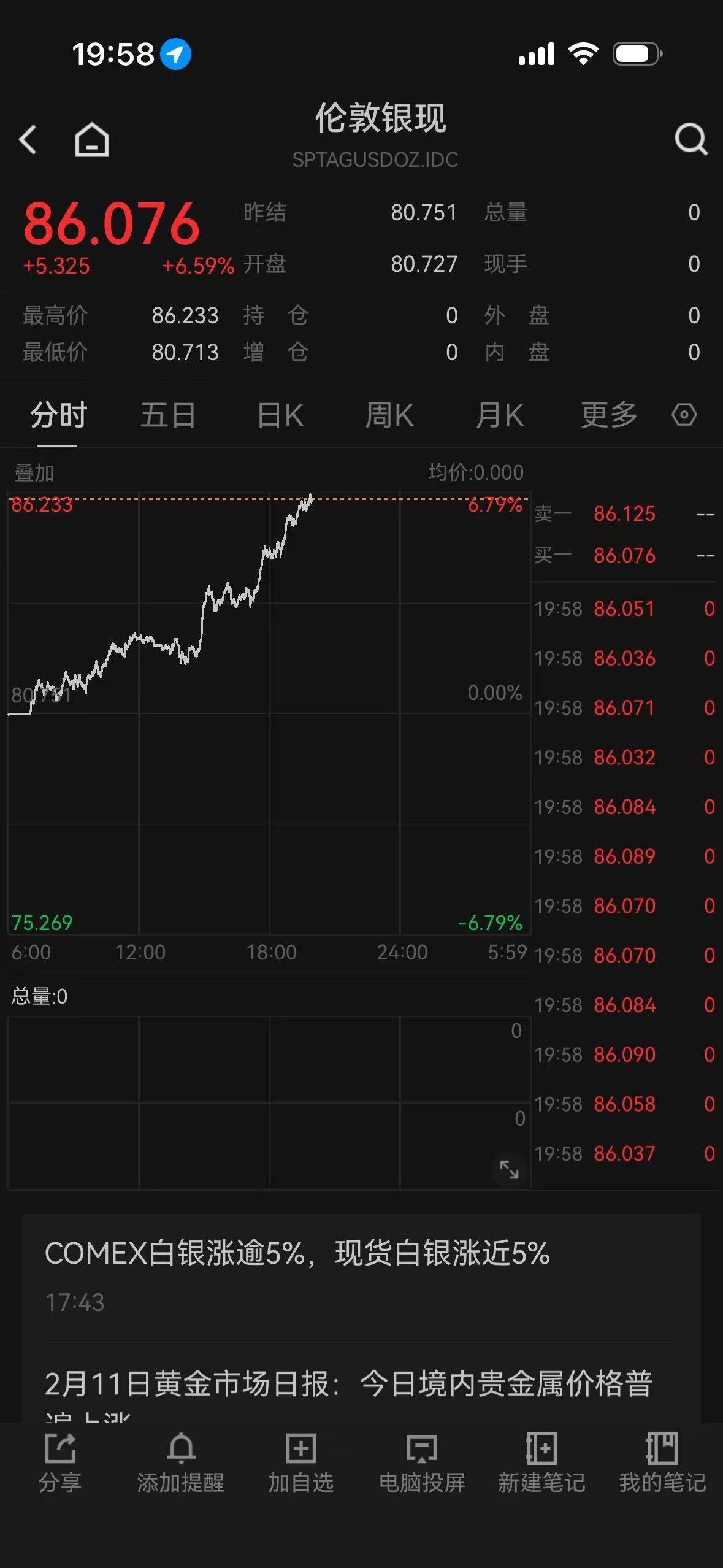 突然拉升!黄金站上5100美元/盎司 白银大涨近7%来源:潮新闻2026-02-11 22:06:3411日晚,贵金属价格突然拉升。现货黄金一举突破5100美元/盎司,涨幅达1.66%。现货白银更是大涨近7%,已经站上86美元/盎司。责任编辑:张晨