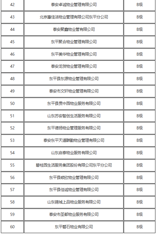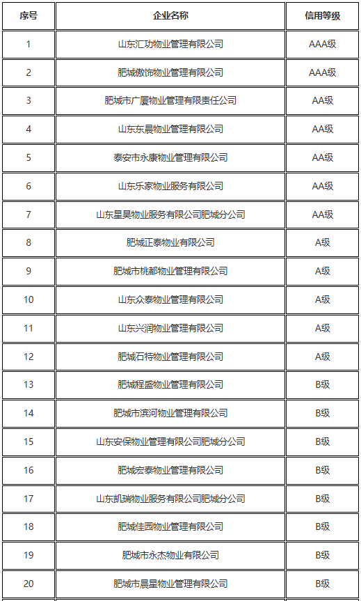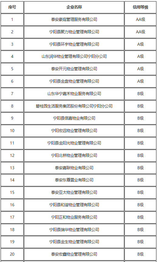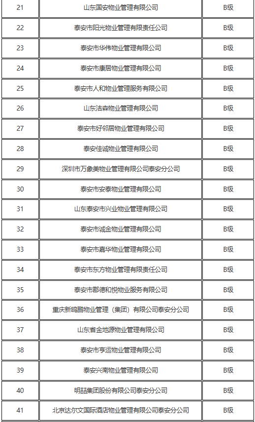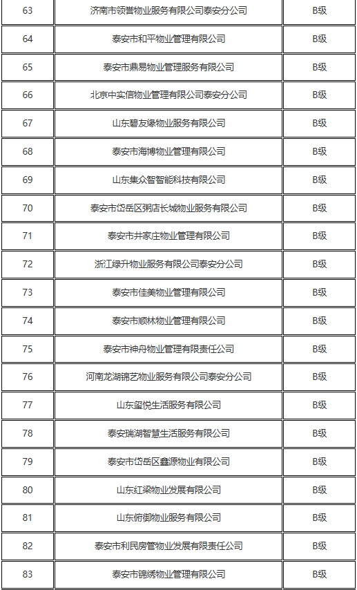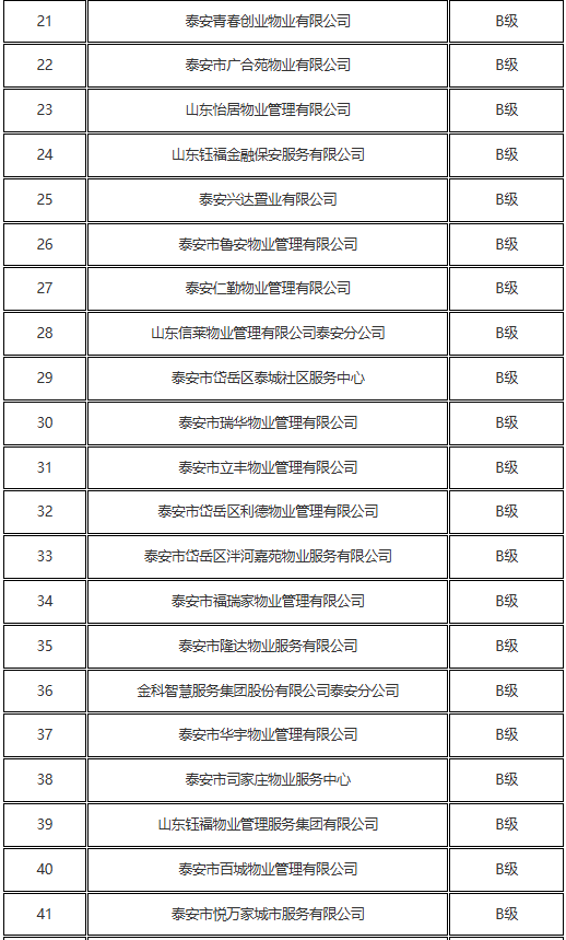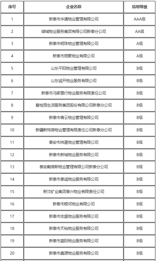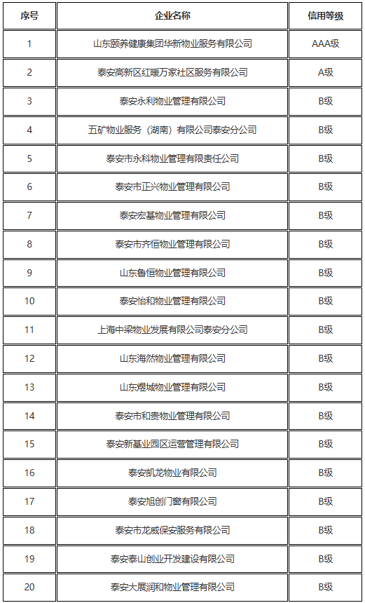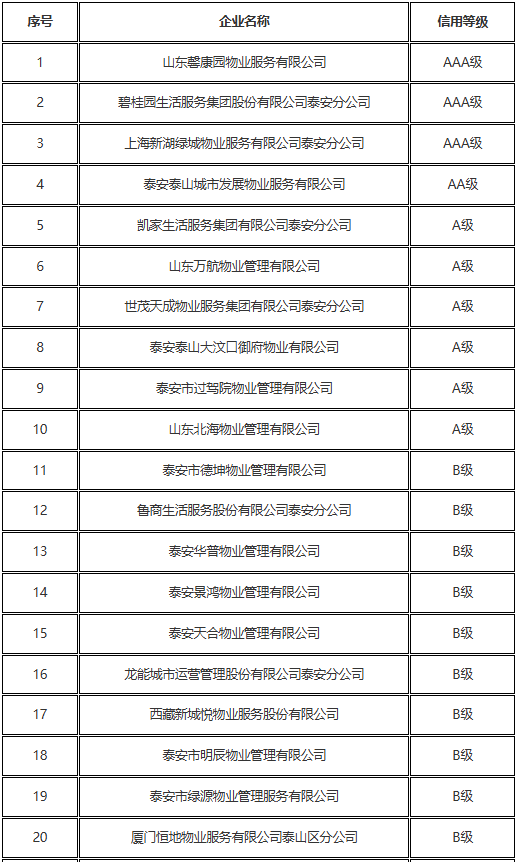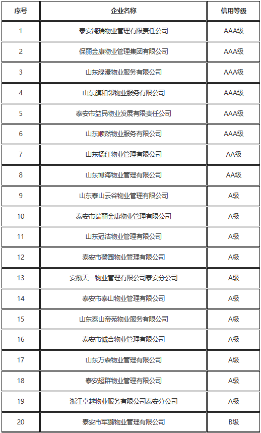 现将泰安市2025年度第四季度物业服务企业信用等级结果公布如下:
