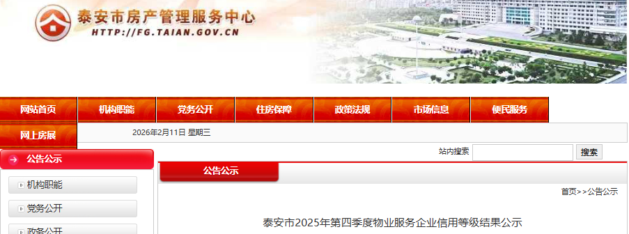 2月11日,泰安市房产管理服务中心发布泰安市2025年第四季度物业服务企业信用等级结果公示,详情——