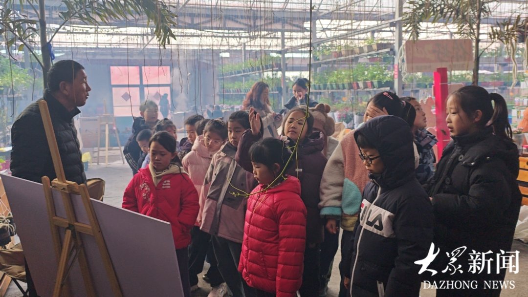 “黄瓜的花是黄色的,西红柿的叶子有特殊气味,大家看这片叶子上的纹路,就是大自然给植物设计的‘血管’。”2月7日,孩子们拿着笔记本穿梭在农场大棚与养殖区之间,带队老师用生动的语言讲解农耕知识,鼓励他们用手触摸、用鼻子闻、用眼睛观察。在这场“乡野拾趣·研学知农”的自然探索中,田野成为最生动的教室。
