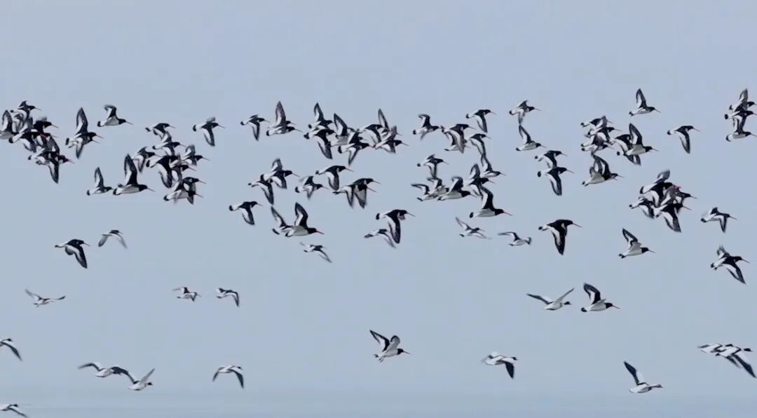滩涂之上,成群蛎鹬鸟或悠然漫步、觅食嬉戏,或振翅凌空、自在翱翔,与碧波万顷的大海相映成趣,勾勒出一幅生机盎然、灵动秀美的生态画卷。