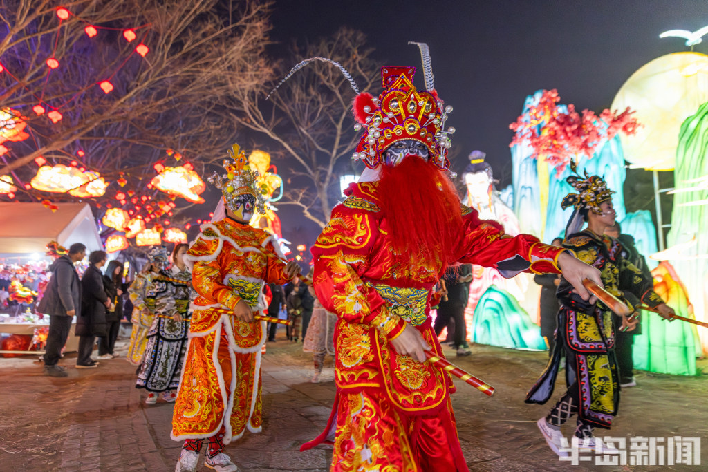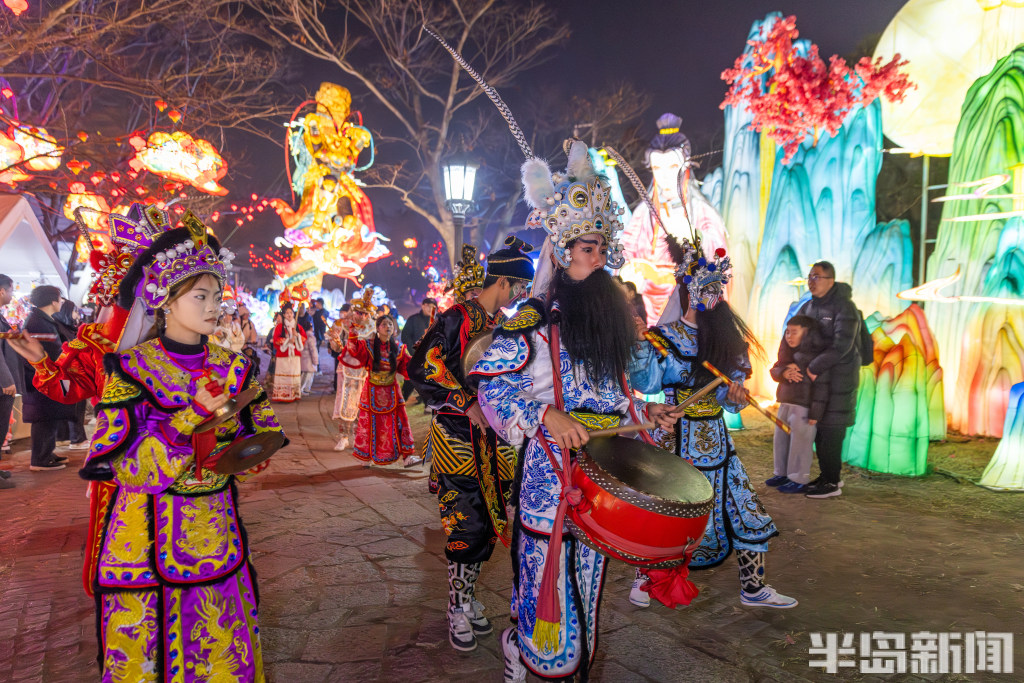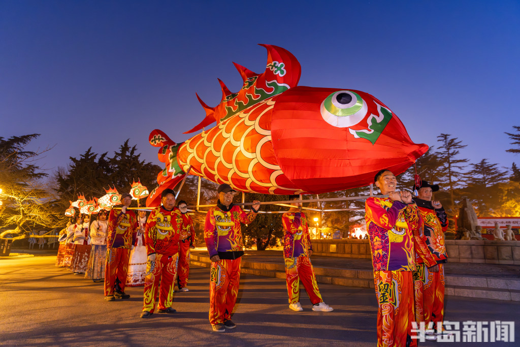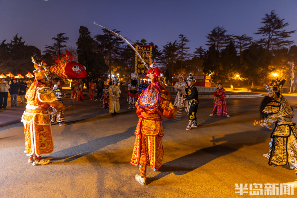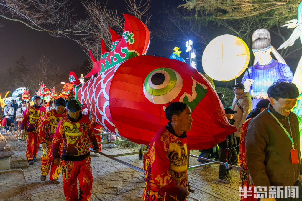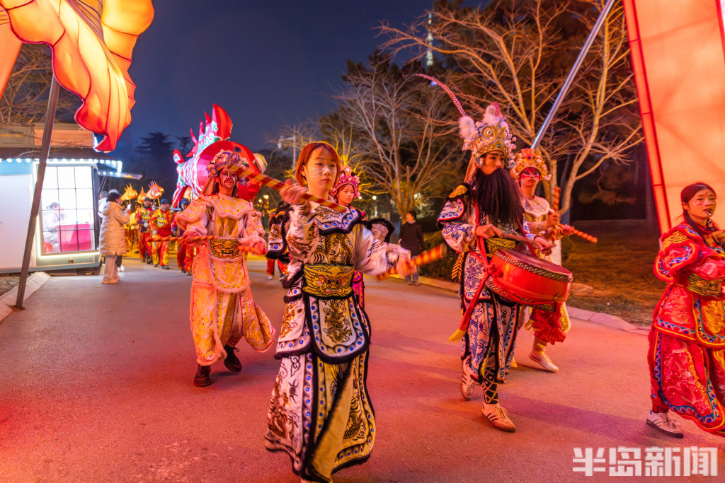 2月12日晚,青岛中山公园里,热闹的非遗英歌舞表演与趣味鱼灯巡游等活动,营造出火热喜庆的新春氛围。