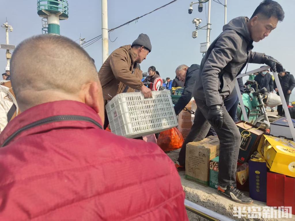 上午10时30分,记者在绿岛渡口附近的一处停车场看到,赶集归来的村民们提着大包小包的年货,匆匆奔向前方不远处的码头。不少村民由于采买的年货太多,干脆找来一辆平板车,一起推着往码头赶。记者跟随多位村民来到码头看到,“田横岛号”渡船正停泊在岸边,村民们忙着往船上搬运年货。水果、肉食、蔬菜……各种各样的年货在船舱里摆得满满当当。青岛海事局两名执法人员正在现场维持秩序,引导村民有序登船。