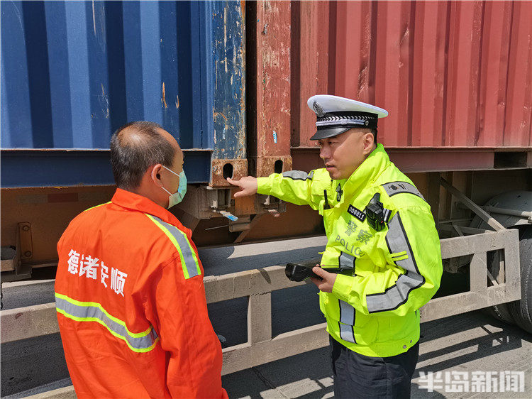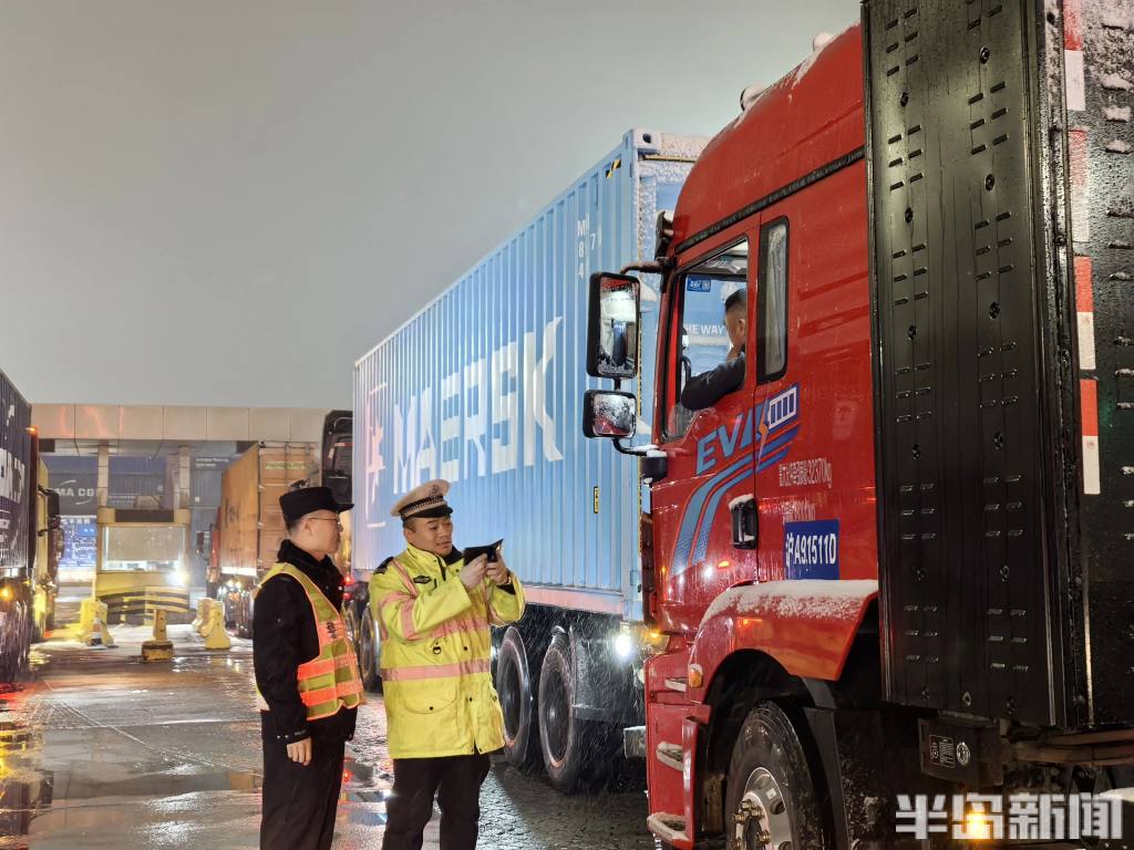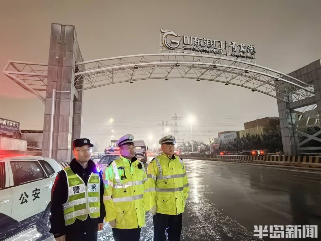 “车辆保持距离,大家一定要排队慢行……”在青岛西海岸新区奋进北路上,成排的大货车有序驶入港区场站,寒风中,青岛市公安局港航公安局前湾北港区派出所民警们正和交警一起维持交通秩序。