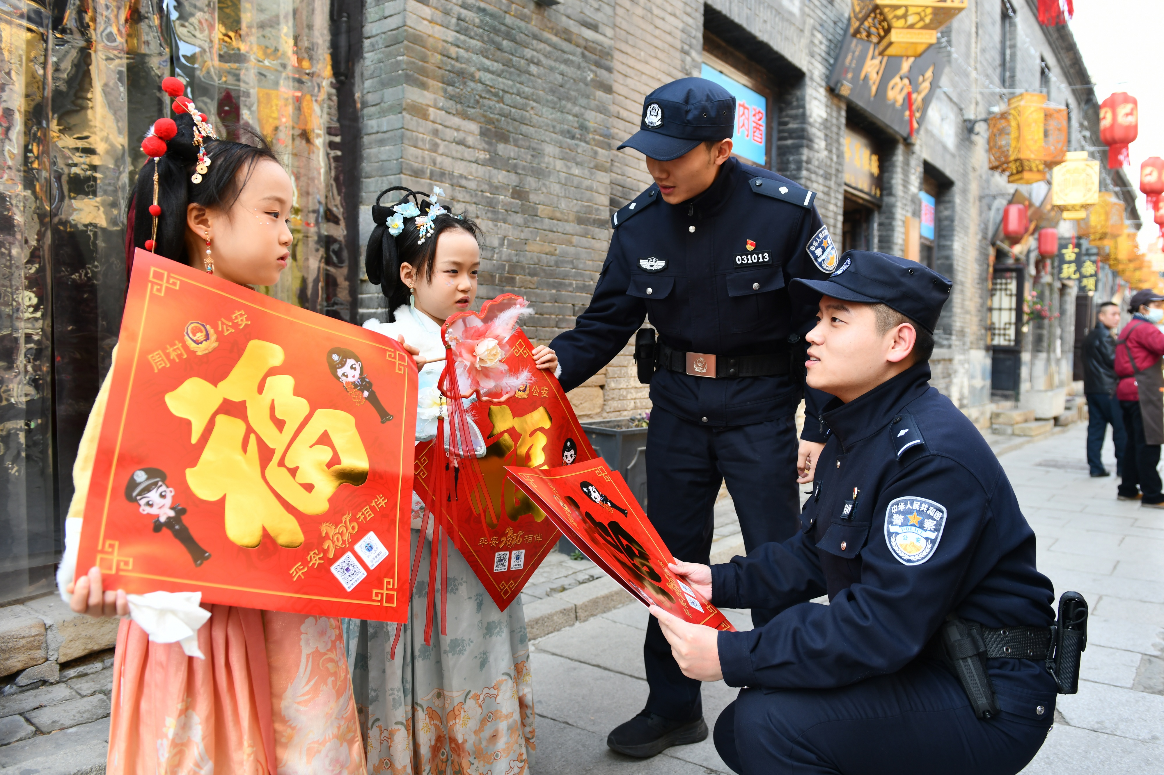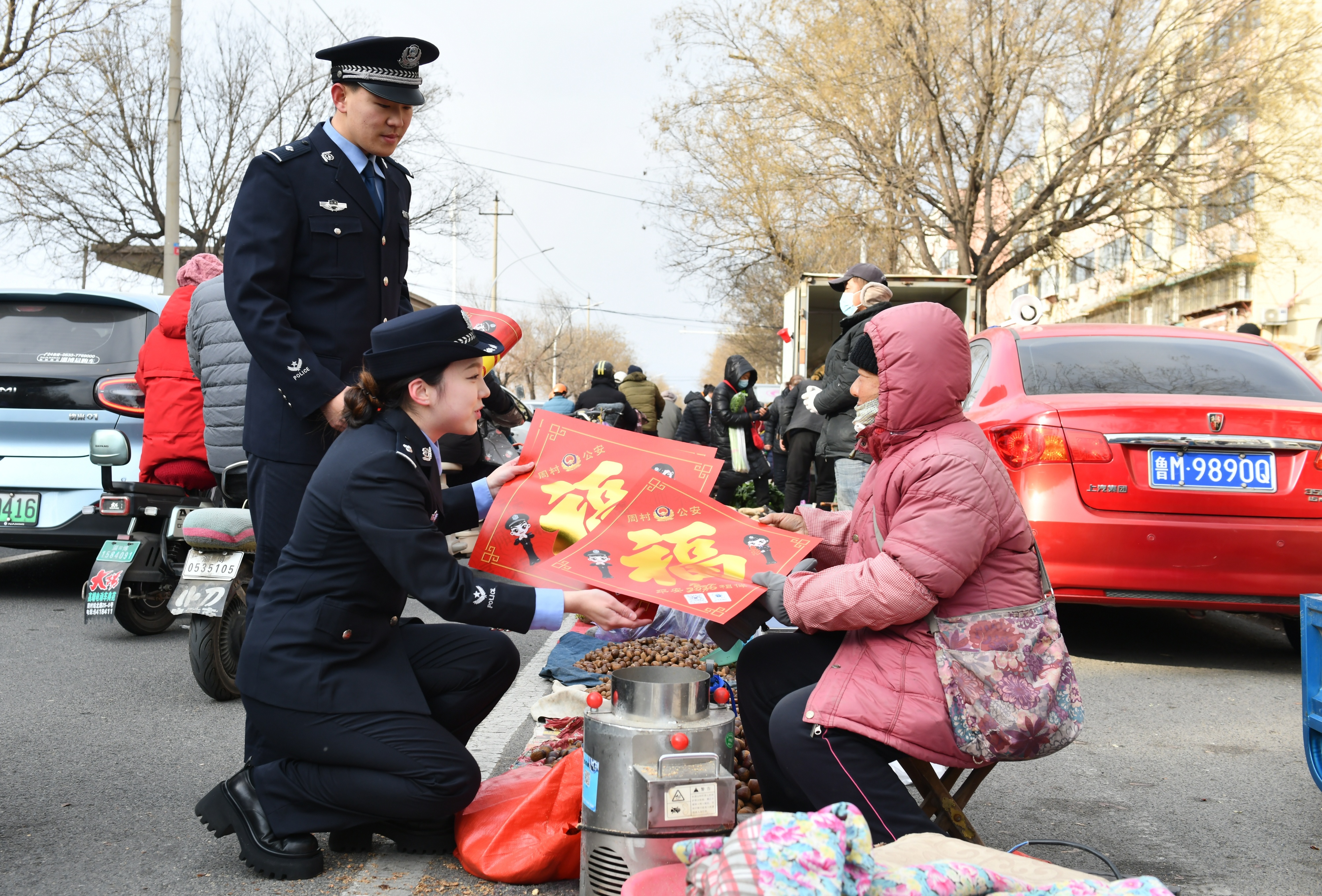 春节将至,年味正浓。2月12日,周村公安分局开展新春走基层送“福”护平安活动。民辅警们将新春送福、巡逻防控、反诈宣传深度融合,穿梭在辖区商圈集市、街头巷尾、企业村庄,用脚步守护着“村里”平安,为群众营造一份最浓“年味”。