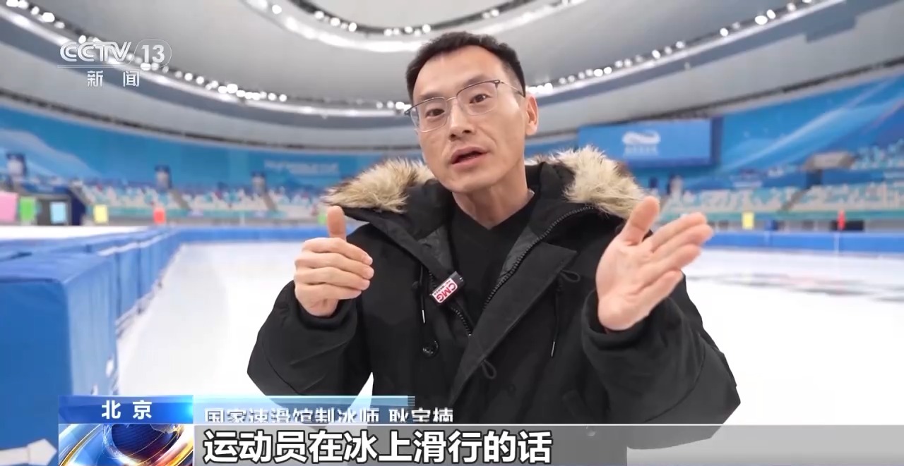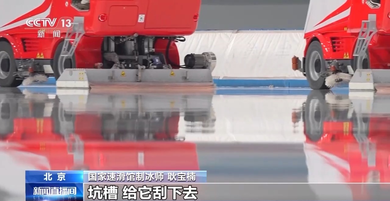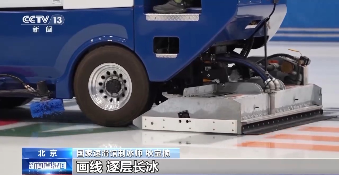 国家速滑馆制冰师 耿宝楠:运动员在冰上滑行的话,它底下的冰刀对冰面有划痕。浇冰车的爬犁底下它是有刀的,把冰面的碎屑和划痕、坑槽给它刮下去。